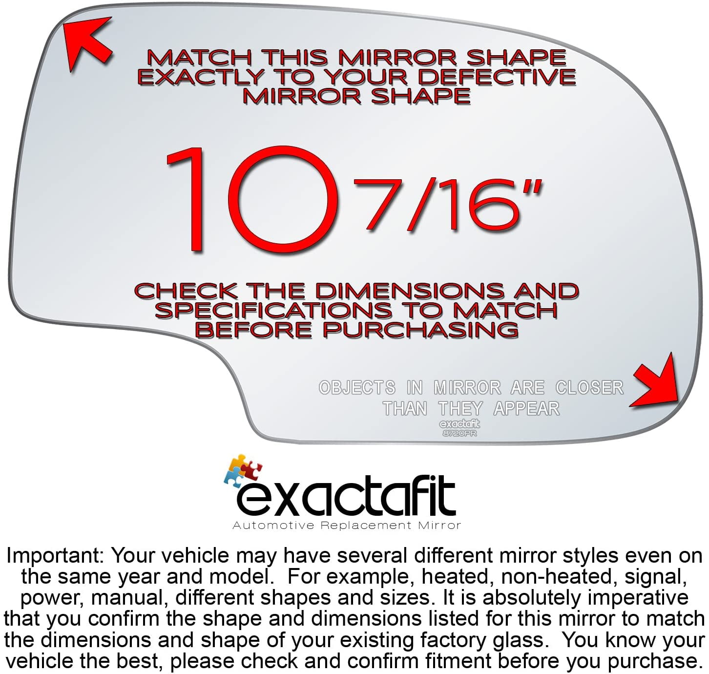 exactafit 8720PR Passenger Side Mirror Right Hand Glass Replacement Fits Cadillac Escalade, Chevy GMC Avalanche, Silverado, Sierra, Suburban, Tahoe, Yukon XL