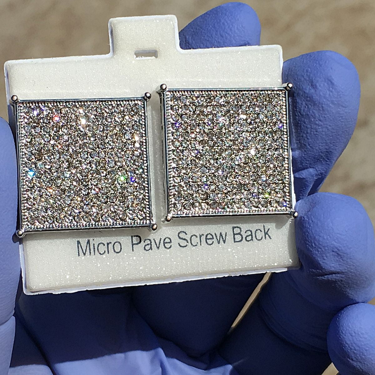Big 20 mm Square Hip Hop Earrings Iced Silver Finish 4 Prong Screw Back Micro Pave 11 Rows