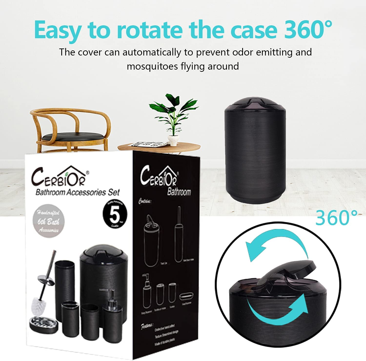 CERBIOR offer a wide array of bath accessories and collections for home. From sleek and modern to classic and trendy our products add a fresh clean look to any bathroom space. Product description Exquisite Packaging , Set Includes :1 Soap Dispenser, 1 Toothbrush Holder, 1 Tumbler, 1 Soap Dish, 1 Toilet Brush Holder,1 Trash Can Bathroom Accessories Set 4 Piece Dishwasher Safe, High quality plastic bath accessories will resist to constant use, keeping their look just as elegant and new over time. Organizing and decorating your bathroom in an easier way, use CERBIOR bath accessories set to organize and transform your bathroom from dull to cute!