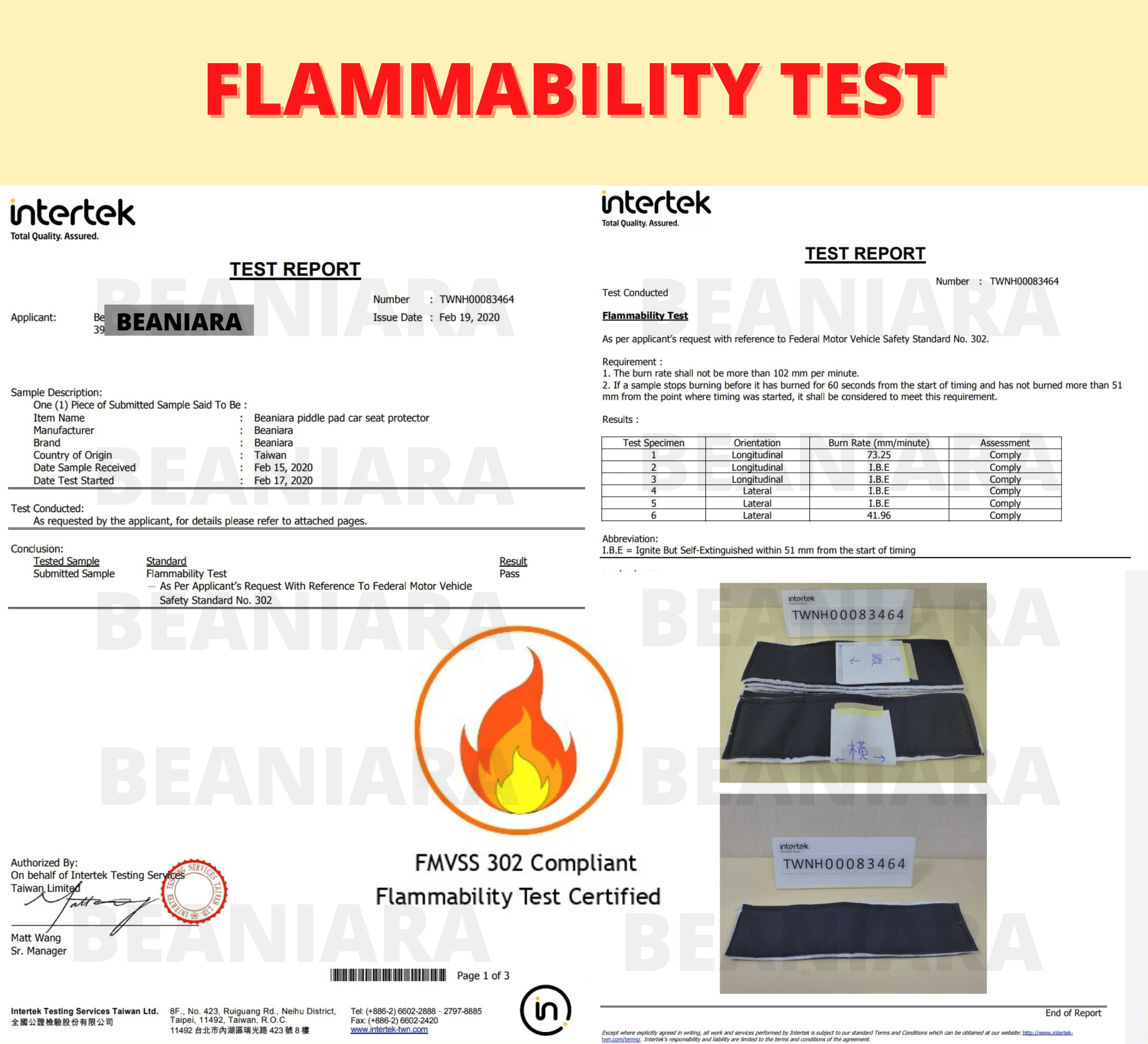 - Crash & Flammability Tested – Child safety is our highest priority. Our car seat protector has been tested to meet the standards of FMVSS213 car crash test and FMVSS302 flammability test.