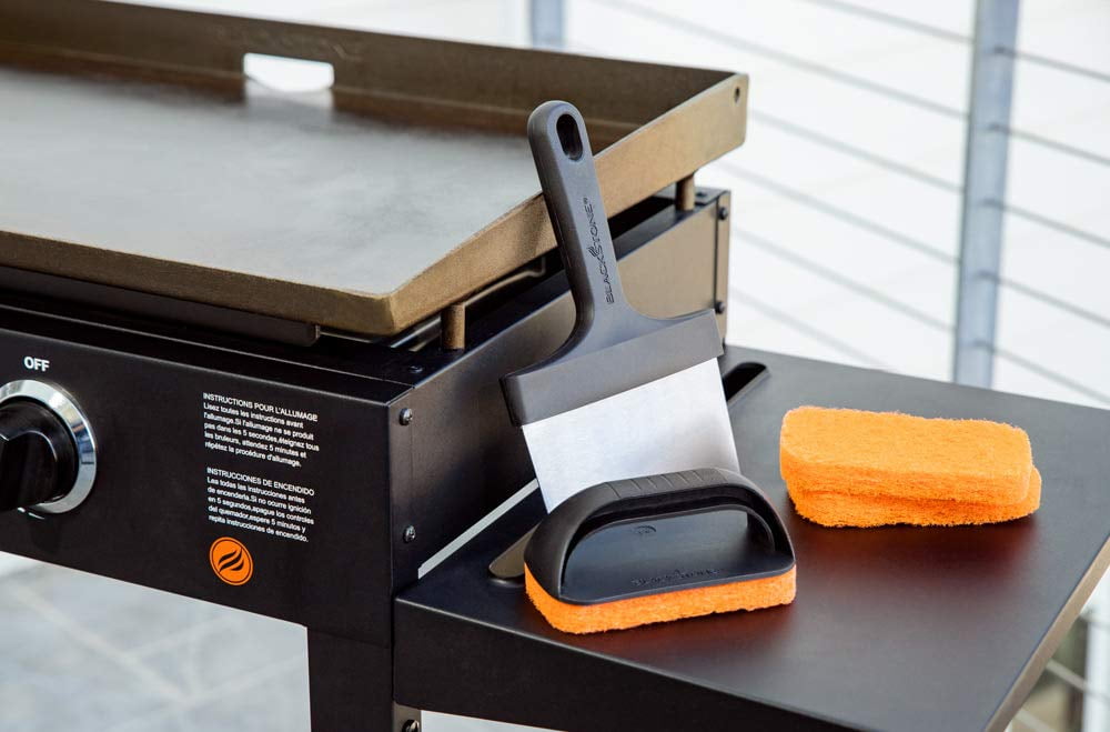 Deep clean your dirty griddle top with the Blackstone 5 Piece Professional Griddle Cleaning Kit. This kit includes a heavy-duty 6-inch stainless steel griddle scraper to remove debris, cooked-on food, and other residue. The 5 Piece Cleaning Kit also features a handle for 3 Scour Pads. Designed to clean griddle tops, wet or dry, the replaceable pad resists clogging and rinses clean. Features : Blackstone Griddle Cleaning Kit. 6-inch stainless steel griddle scraper. 3 Scour Pads. 1 Pad handle.Griddle Cleaning Kit (scrubber handle, scrub pads, and scraper – plastic handle)
