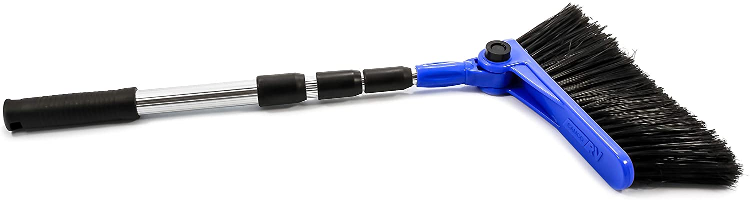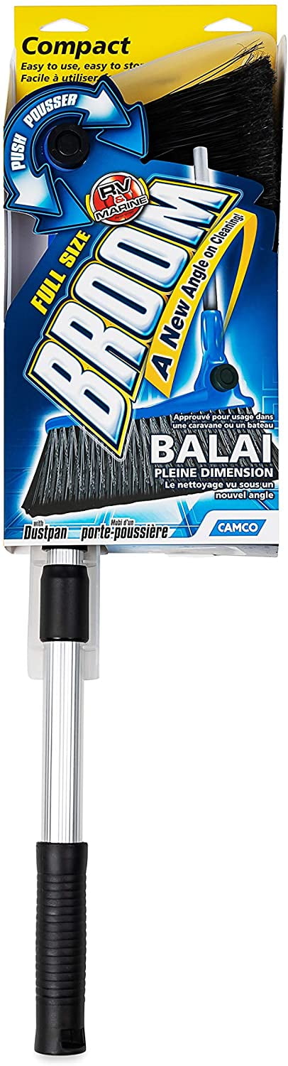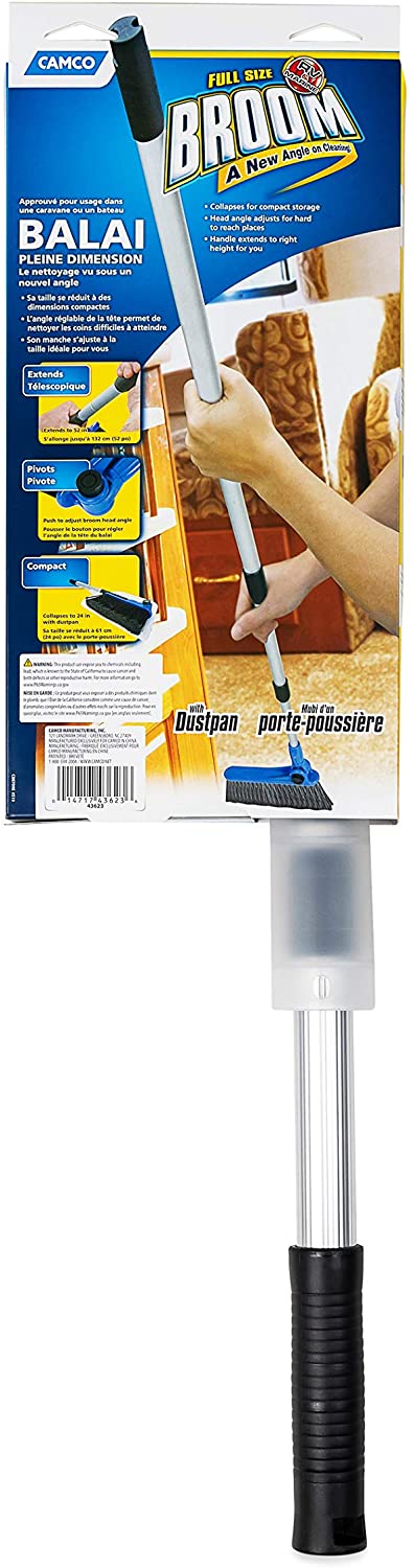 Camco RV Adjustable Broom and Dustpan goes from a full size broom and telescopes down to store compactly. Soft-bristled head adjusts to different angles for maximum cleaning power. Handle length is adjustable, too! Handy dustpan clips onto broom handle for storage. 52-inches long broom telescopes down to just 24-inches for compact storage