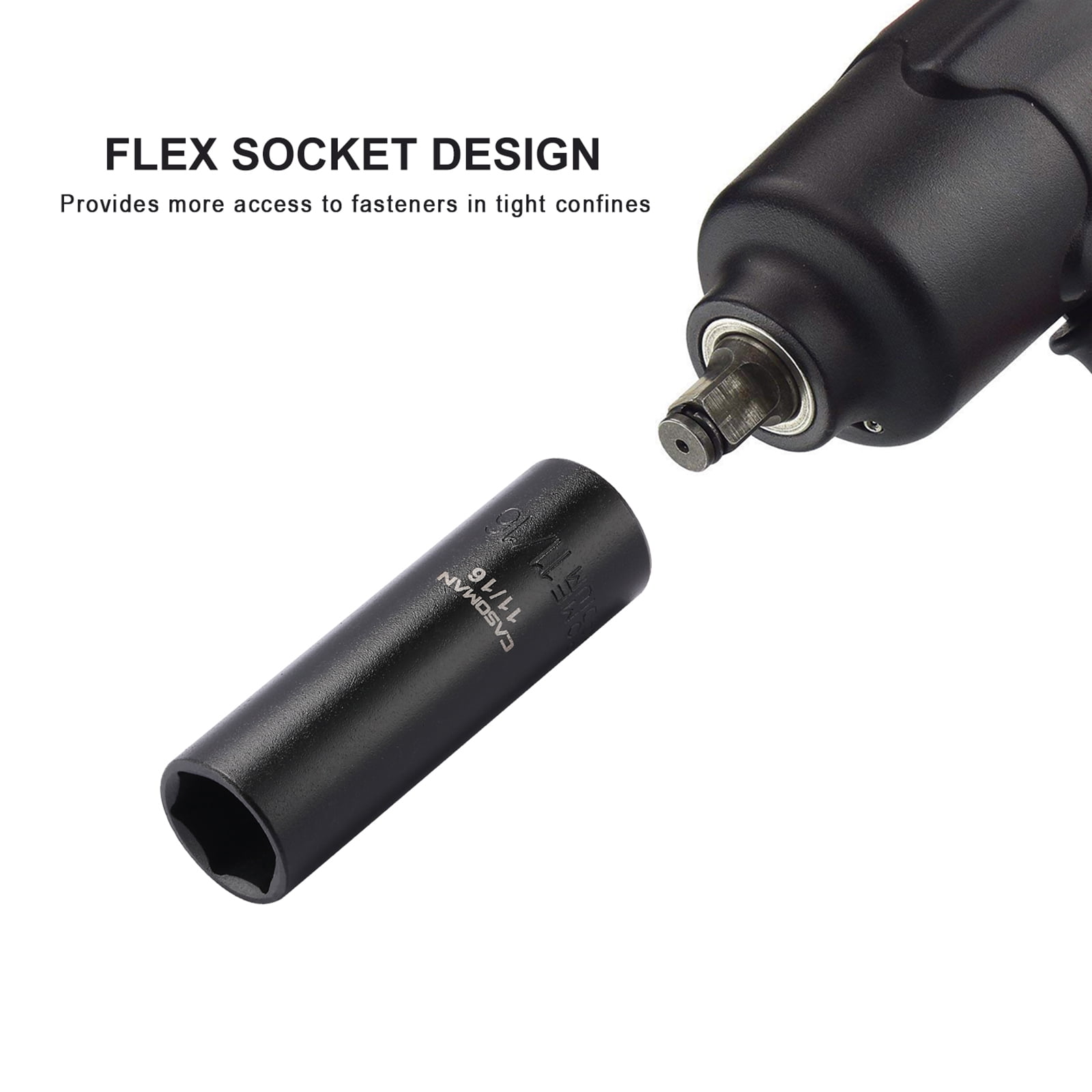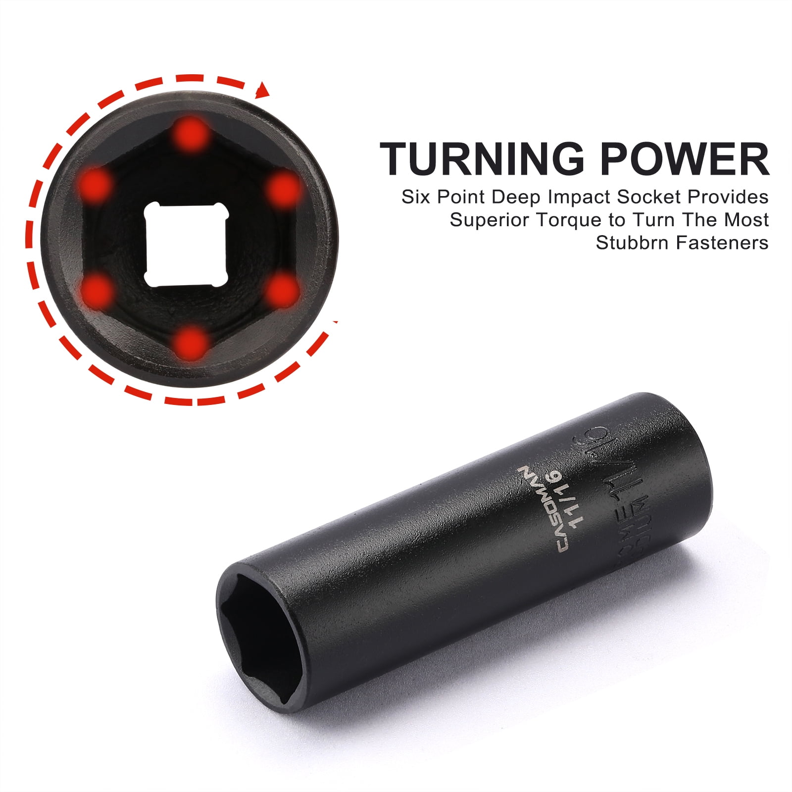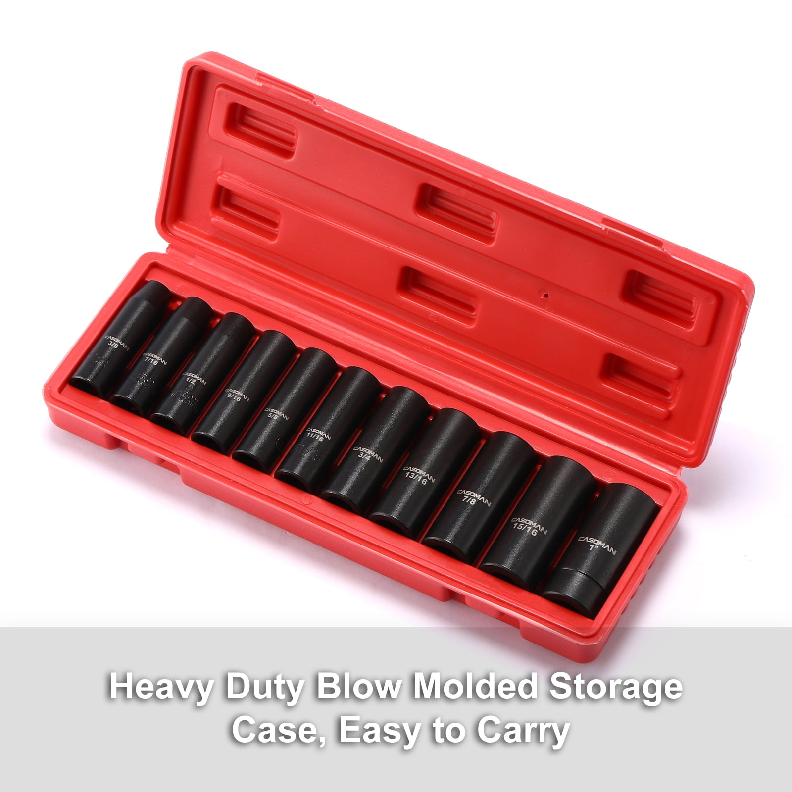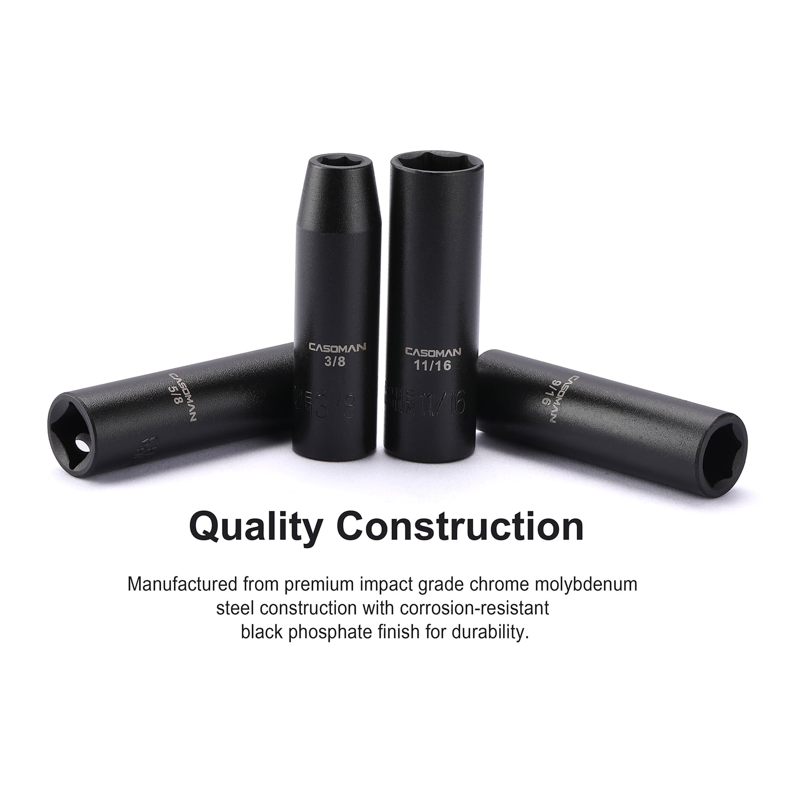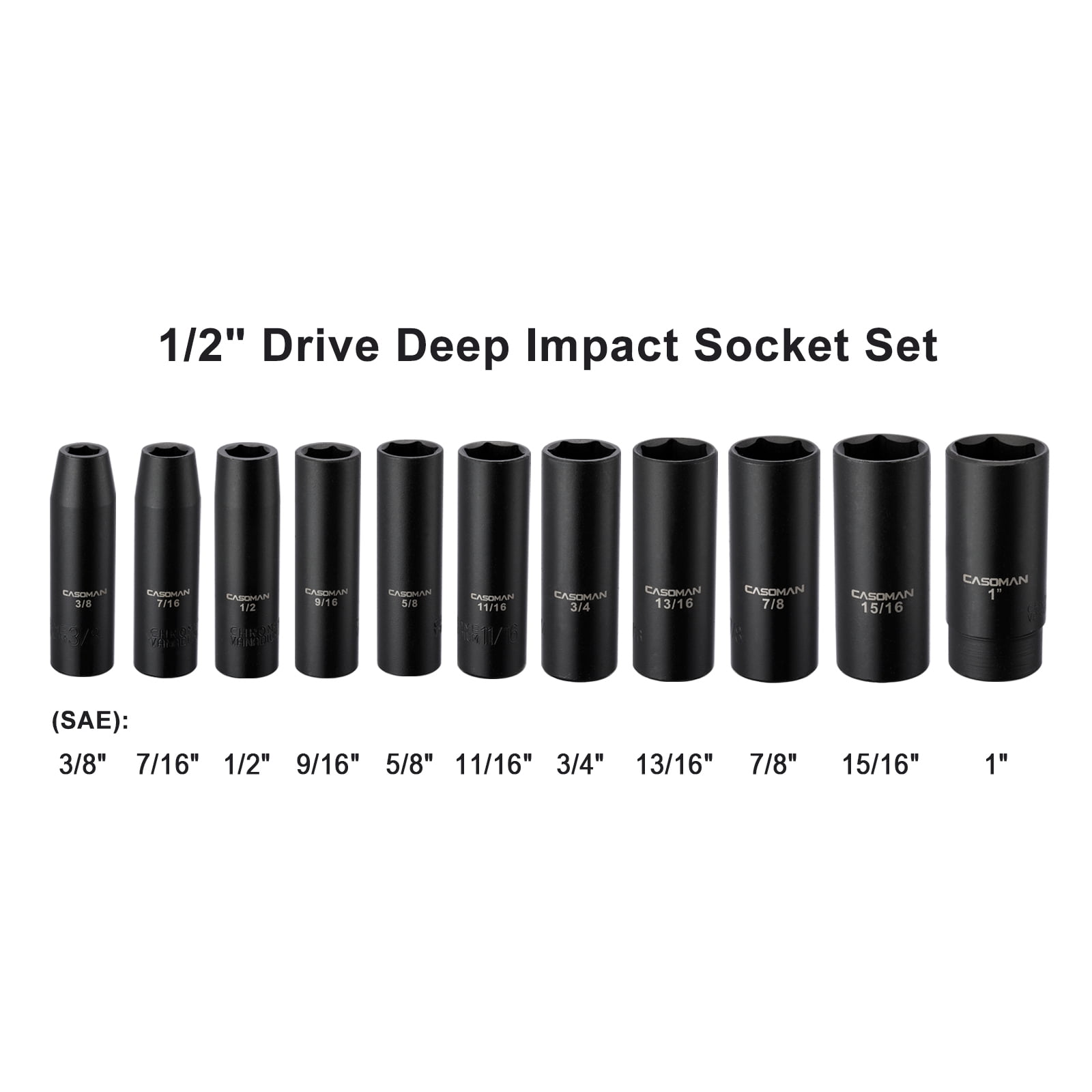 The CASOMAM 11 Pieces 1/2-Inch Drive Deep Impact Socket Set, CR-MO, SAE, 3/8-Inch to 1-Inch, which is made from drop forged and heat treated chrome vanadium steel(50BV30) with a corrosion-resistant black phosphate finish, 6-point flank drive design grips fastener more tightly on the flat sides and prevents rounding off at corners.