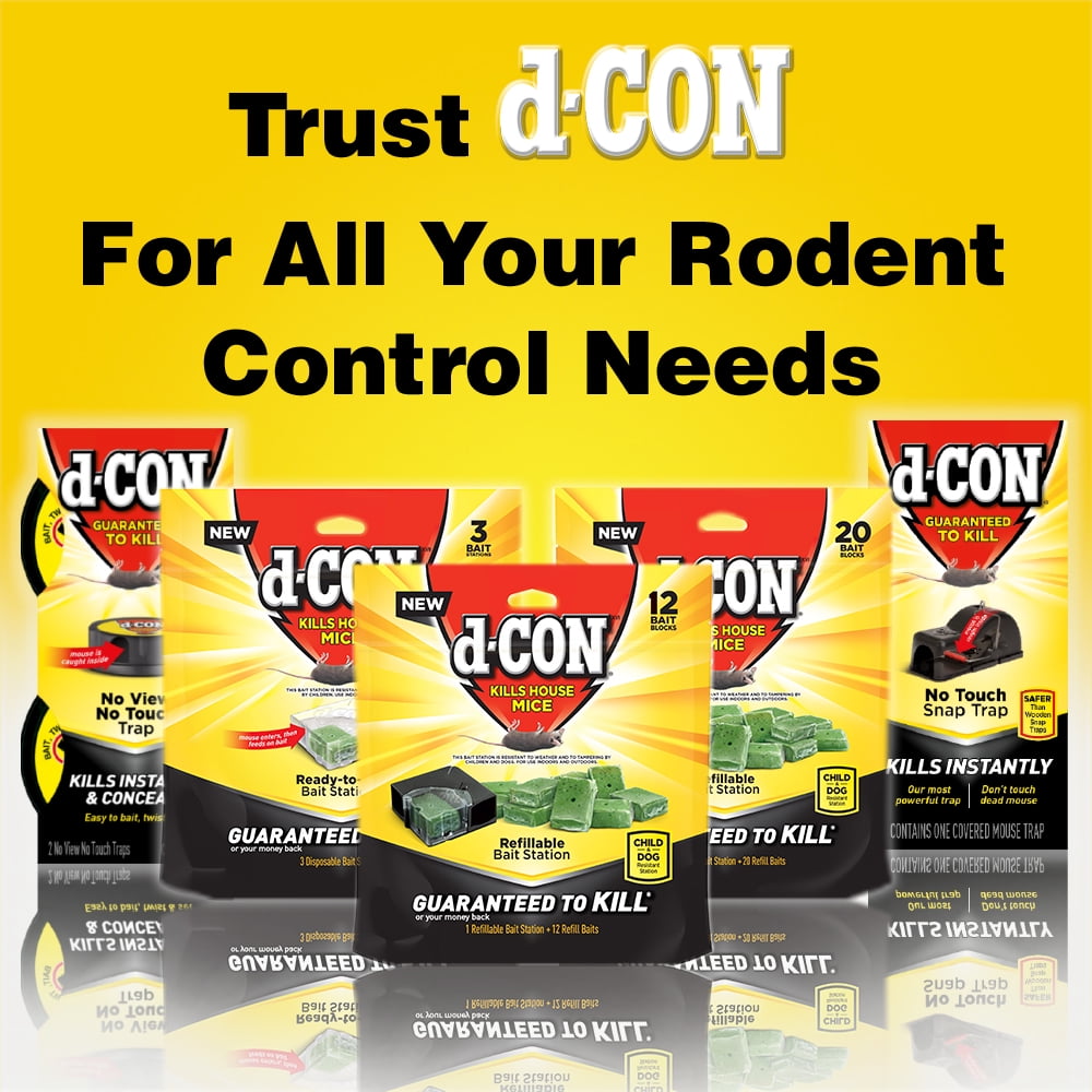 d-CON is so d-LICIOUS that mice will risk their lives for it. The formula does not contain neurotoxins or anti-coagulants. If you have signs of mice (droppings, footprints, gnawing or scampering noises in your walls), you’ll want to try this d-CON Refillable Bait Station. Place the station where you notice signs of mice activity. You’ll be able to see the bait through the station to gauge if mice are eating it or not. Once you notice signs of mice feeding on the baits, mouse activity should cease within a few days. If you don’t see chew marks on the bait after a few days, try moving it to another area. d-CON Corner Fit Mouse Poison Bait Station has a compact design & low profile to help reduce house mice problems. This is our safest bait station, and is resistant to tampering by children & dogs. The refillable mouse bait station houses the bait in a box designed for mice to enter the station, eat the bait and leave before dying. This weather-resistant bait station can be used indoors or outdoors. It can be used in tight places around the house. Ideal for: corners, attics, behind appliances, basements, garages and sheds.