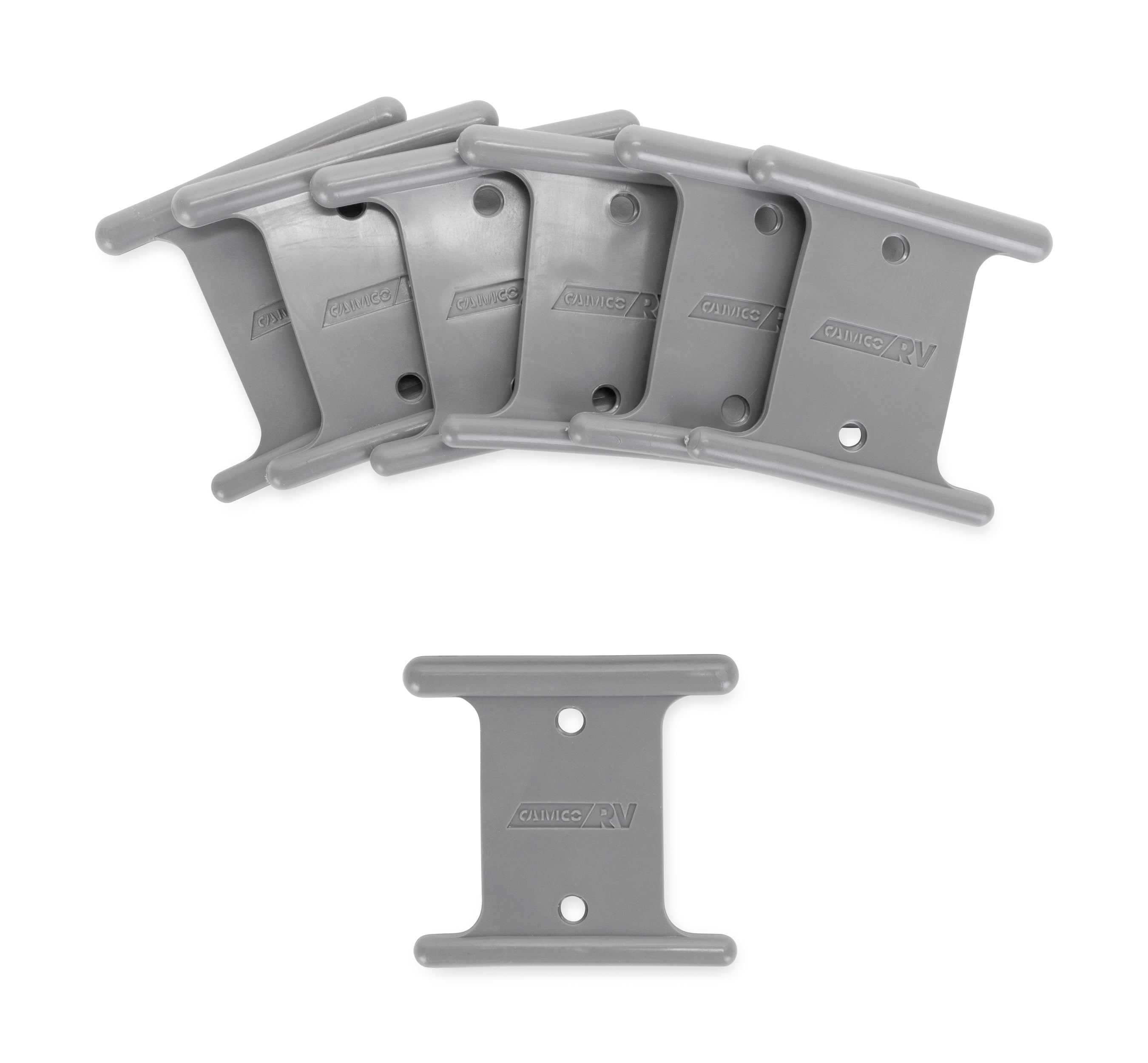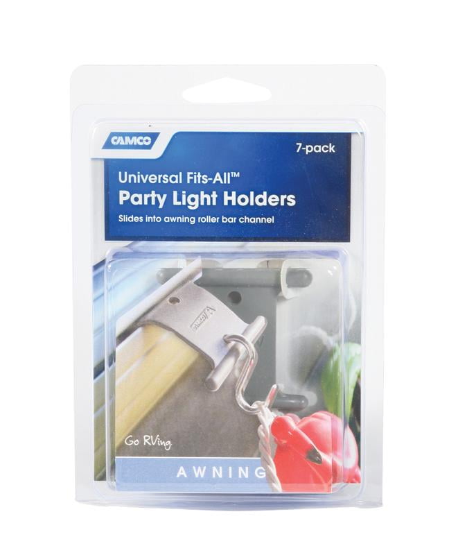 Camco RV Gray Party Light Holders hang party lights, signs, plants and more from your awning roller bar. The RV party light holders slide easily into roller bar channel, and each hanger can support up to 15 lbs. Each holder has two sizes of channel insets; fits all automatic roll out awning roller bar channels. Patented. Fits all RVs and comes in a pack of 7.