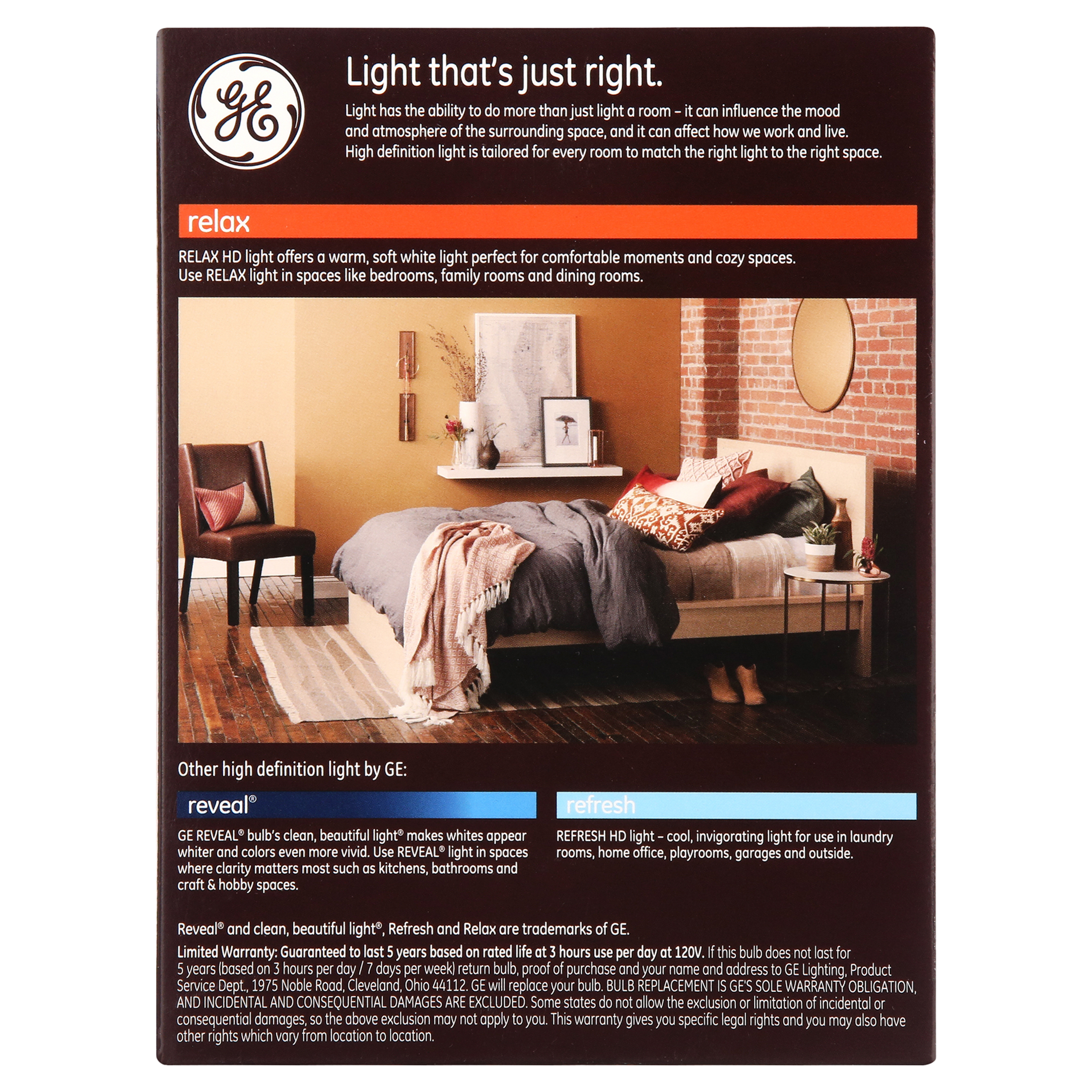 Our High Definition bulbs are an improved, energy-saving LED that enhance the appearance of colors. Experience the difference with bolder colors and enhanced contrast vs. Our standard LED bulbs. Relax HD light offers a warm, soft white light perfect for comfortable moments and cozy spaces. Use Relax HD light in spaces like bedrooms, family rooms and dining rooms.