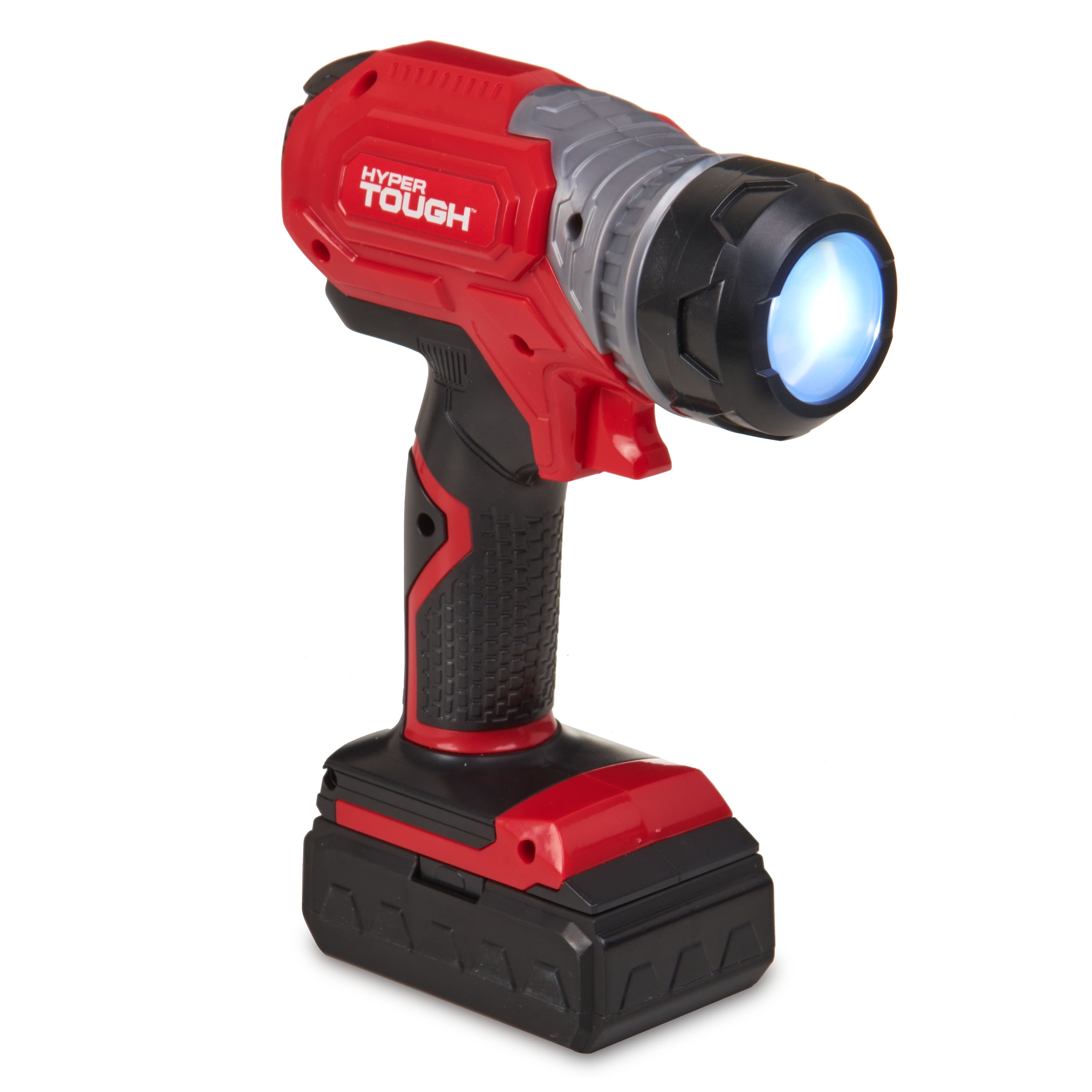 - 28-piece power tool play set includes power drill with sound, jigsaw with sound, light-up flashlight, tape measure, hammer, and other fun tools