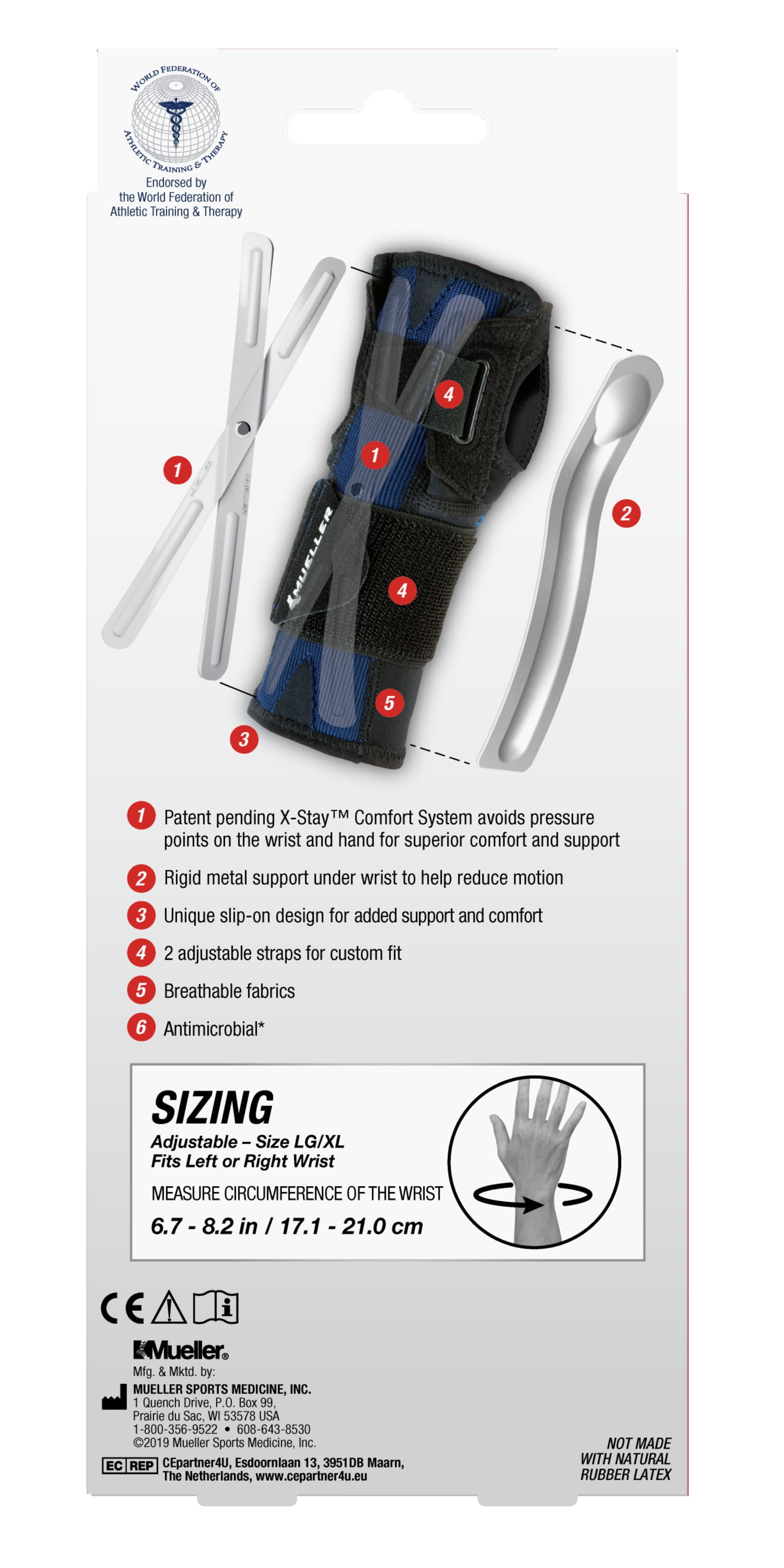 The Mueller X-Stay Wrist Stabilizer helps support weak or injured wrists and aids in the treatment of carpal tunnel syndrome and arthritis. Mueller X-Stay Wrist Stabilizer features an exclusive Patent Pending X shaped stay system for superior comfort and support. Not made with natural rubber latex. Latex-Free Wrist Brace.