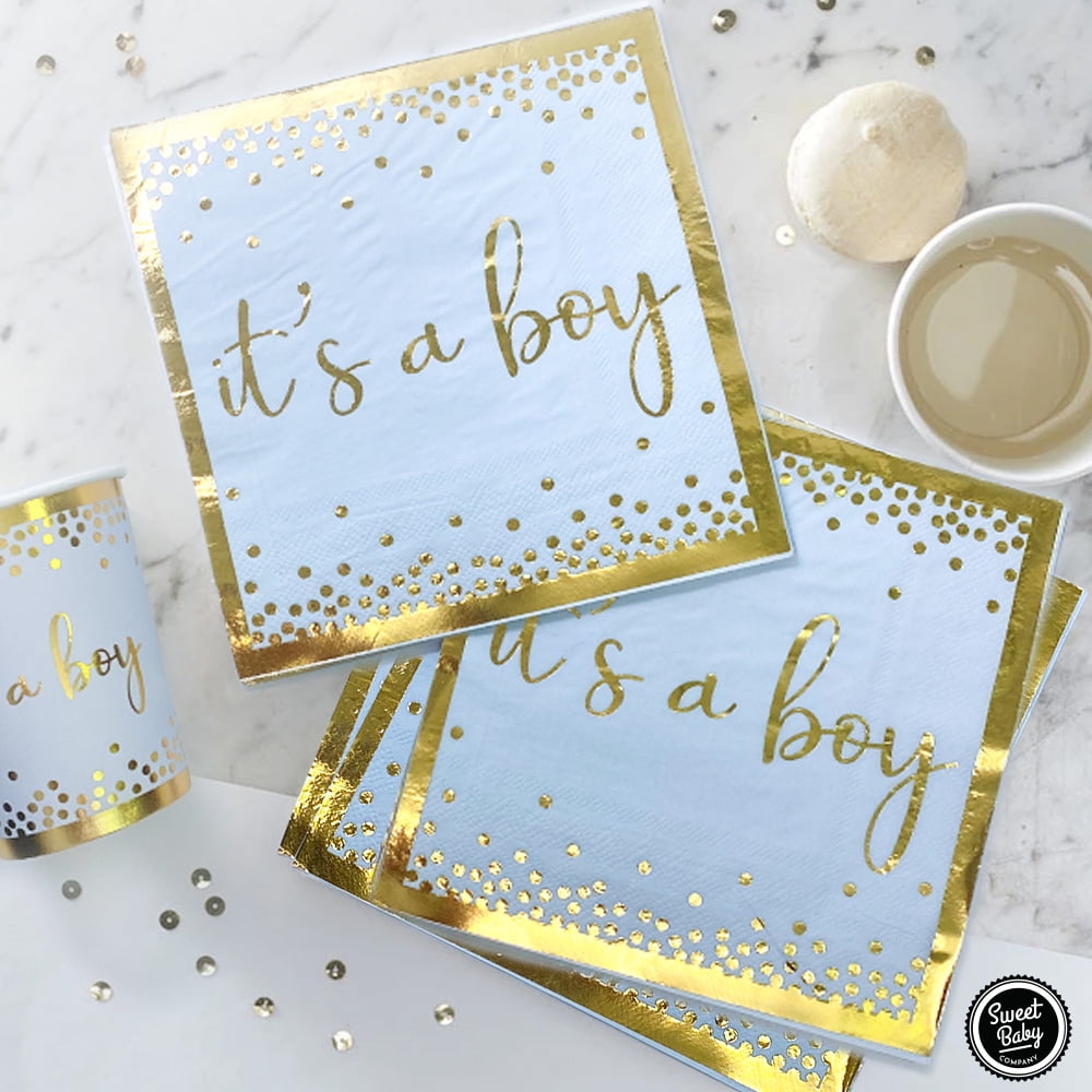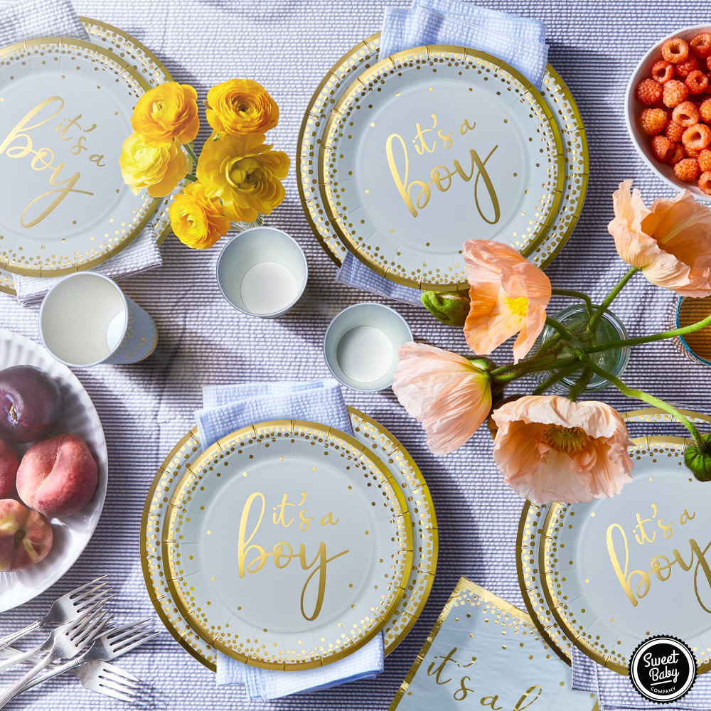 - TABLE SETTING FOR 24 GUESTS: With a special matte powder blue and gold foil "it’s a boy" design, this matching set includes 24- large 9 inch lunch plates, 24- small 7 inch dessert plates, 24- 9 ounce cold beverage cups, 24- 3 ply napkins