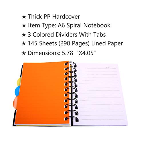 Pocket Notebook A6 Mini Spiral Journals, 3 Subject Planner, Wide Ruled Small Writing Paper, PP Hardcover Notepad, Colored Divider with Tabs for Labels, 290 pages, Black Lined Memo/Scratch Pads/Diary