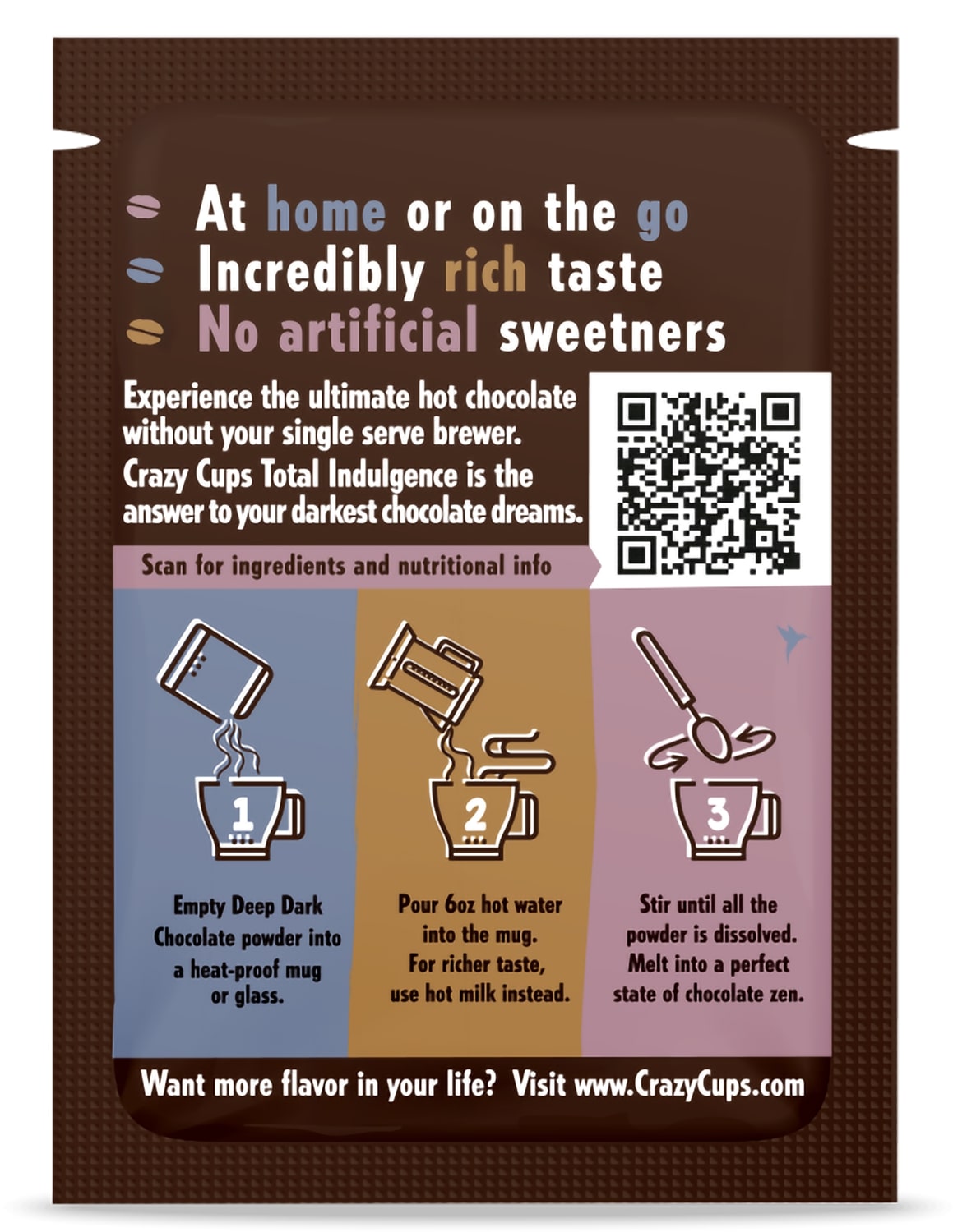- SIMPLE TO USE: Crazy Cups offers the perfect hot cocoa mix packets for any person on-the-go. No need for a single-serve brewer. You simply add your Deep Dark Chocolate Powder to a heat-proof mug, stir in 6 oz of warm water or milk, and enjoy.