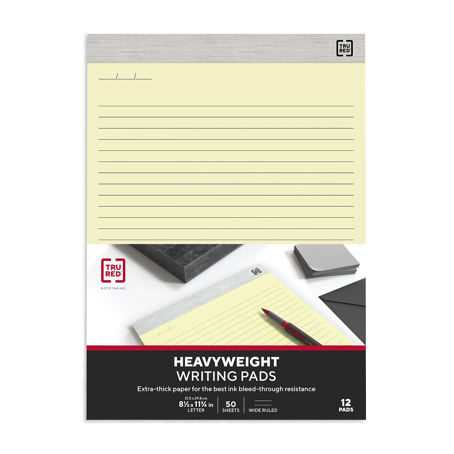 Polish your document drafts and revisions with this 12-pack of TRU RED 8.5 x 11.75-inch canary heavyweight notepads.Stock up the supply closet with this canary heavyweight ruled notepad. The wide ruling helps you write in a straight line and makes text easier to read, while the perforated design lets you tear off pages cleanly and efficiently. These TRU RED 8.5 x 11.75-inch heavyweight canary notepads has a 60-point laminated backer for taking notes on the go. Heavyweight notepad for writing with style. Sheet size: 8.5" x 11.75". 50 perforated sheets per pad. 12 pads per pack. Top-bound design allows you to quickly flip through papers to find information. Wide ruled pads are great for keeping writing neat and legible. Canary paper. Includes 28 horizontal lines per page, plus one line for the date. Features 60 perforating dots per inch. Sold as 12/Pack.TRU RED Notepads 8.5" x 11.75" Wide Ruled Canary 50 Sheets/Pad TR57381
