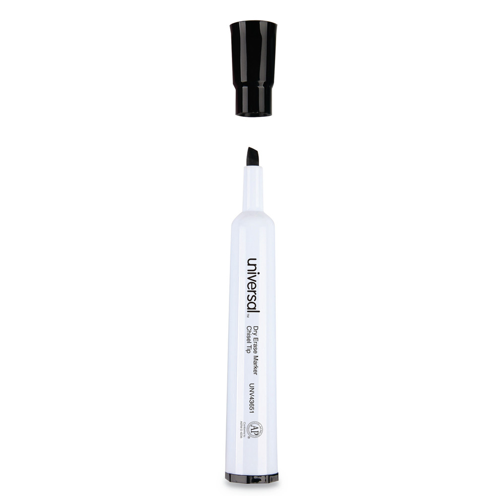 Universal dry erase chisel markers are ideal for whiteboards or glass boards. Rich vibrant black colors lay down evenly, dry instantly, and erase easily. Low-odor so it’s ideal for classrooms and home offices. Non-washable.
