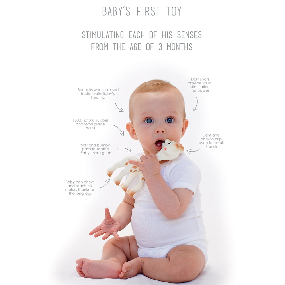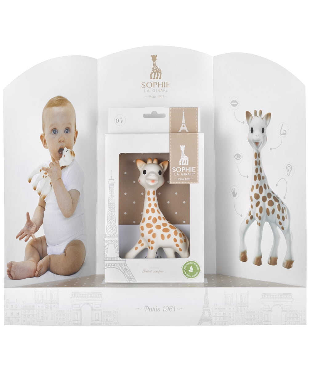 Sophie Born in 1961, her legendary success is huge in France. Made in the French Alps with natural rubber and non-toxic paint, Sophie has been safely cuddled and chewed for over 40 years! She is soft, light, and easy to grasp and fits perfectly into little hands. Sophie is lovable and amusing. She even makes a happy sound when squeezed. Babies especially love her bumpy head to soothe their teething gums. Most importantly her flexible, renewable, natural rubber materials and non-toxic paint mean Sophie the Giraffe is a safe and all-natural teething toy for your little one. Parents world-wide trust the joy this classic toy brings to their babies. In todays fast paced world it is unusual to see a high production toy still made by hand: Sophie requires 14 manual manufacturing steps. Her retro style has ensured that she has remained fashionable for over 40 years. Slender, flexible and soft, baby can squeeze and chew her in complete safety. Lovable and amusing, Sophie laughs when her body is squeezed.