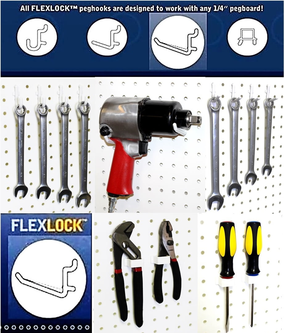 WallPeg 80 Pc. Kit has a mix of 75 locking pegs (4 Styles Including J, L, Jumbo, and Box) & 5 Medium Bins…Flex Lock pegs fit all standard 1/4" hole pegboard and stay in place with our patented Flex-Lock System. Peg hooks can lock into place with a simple bend & snap into place. Peg hooks won’t slip or come out when taking down tools and are easy to move with a simple bend & pull.