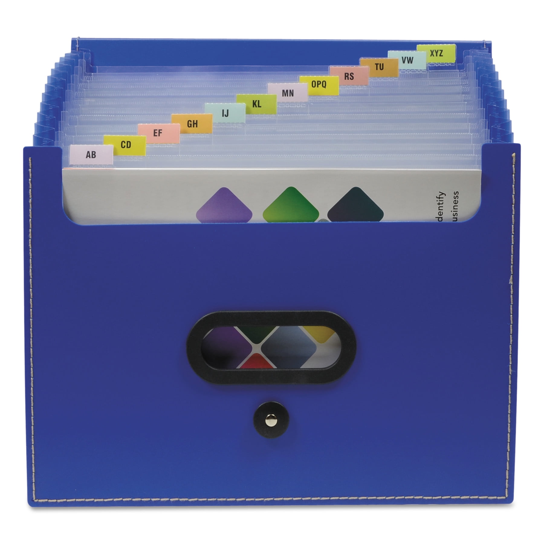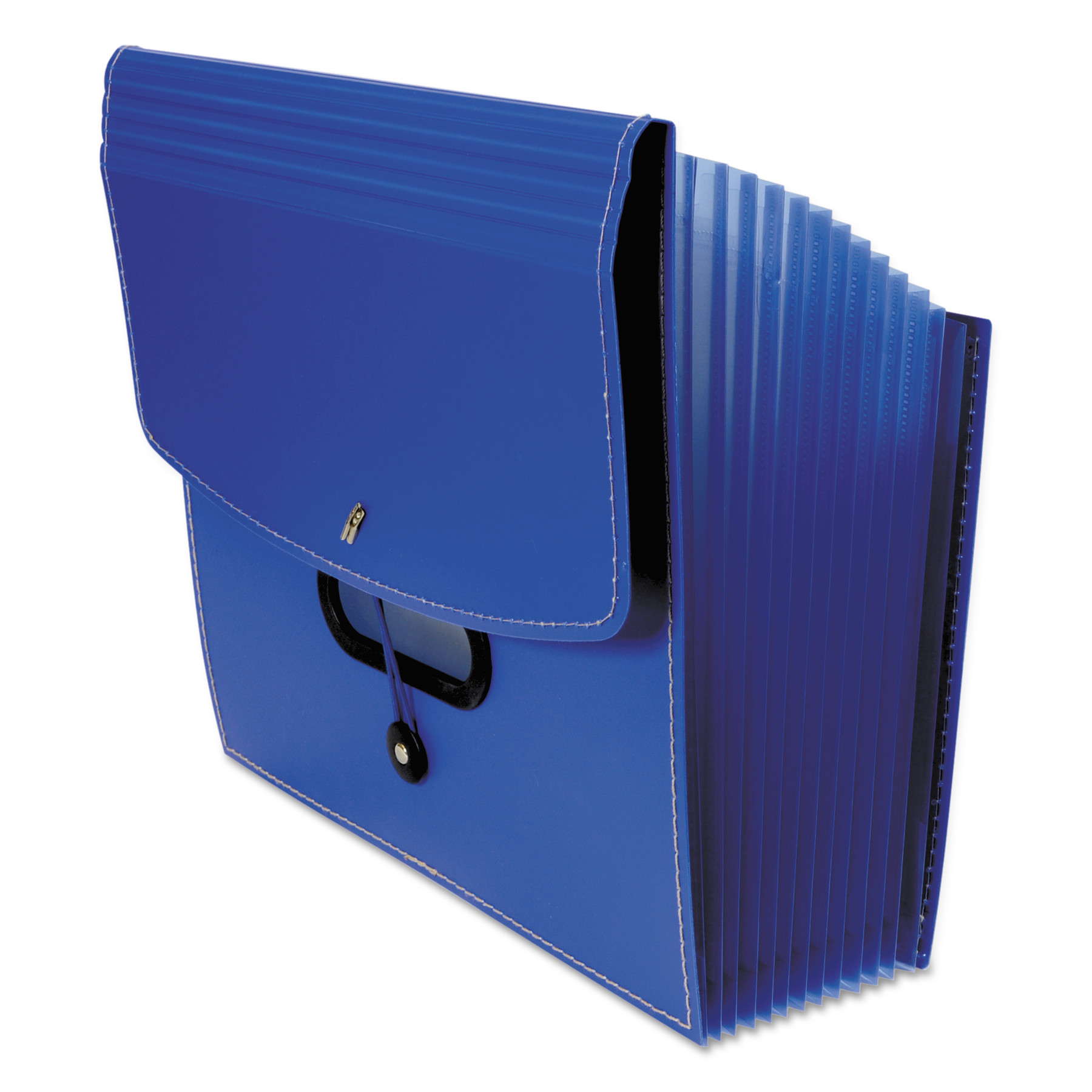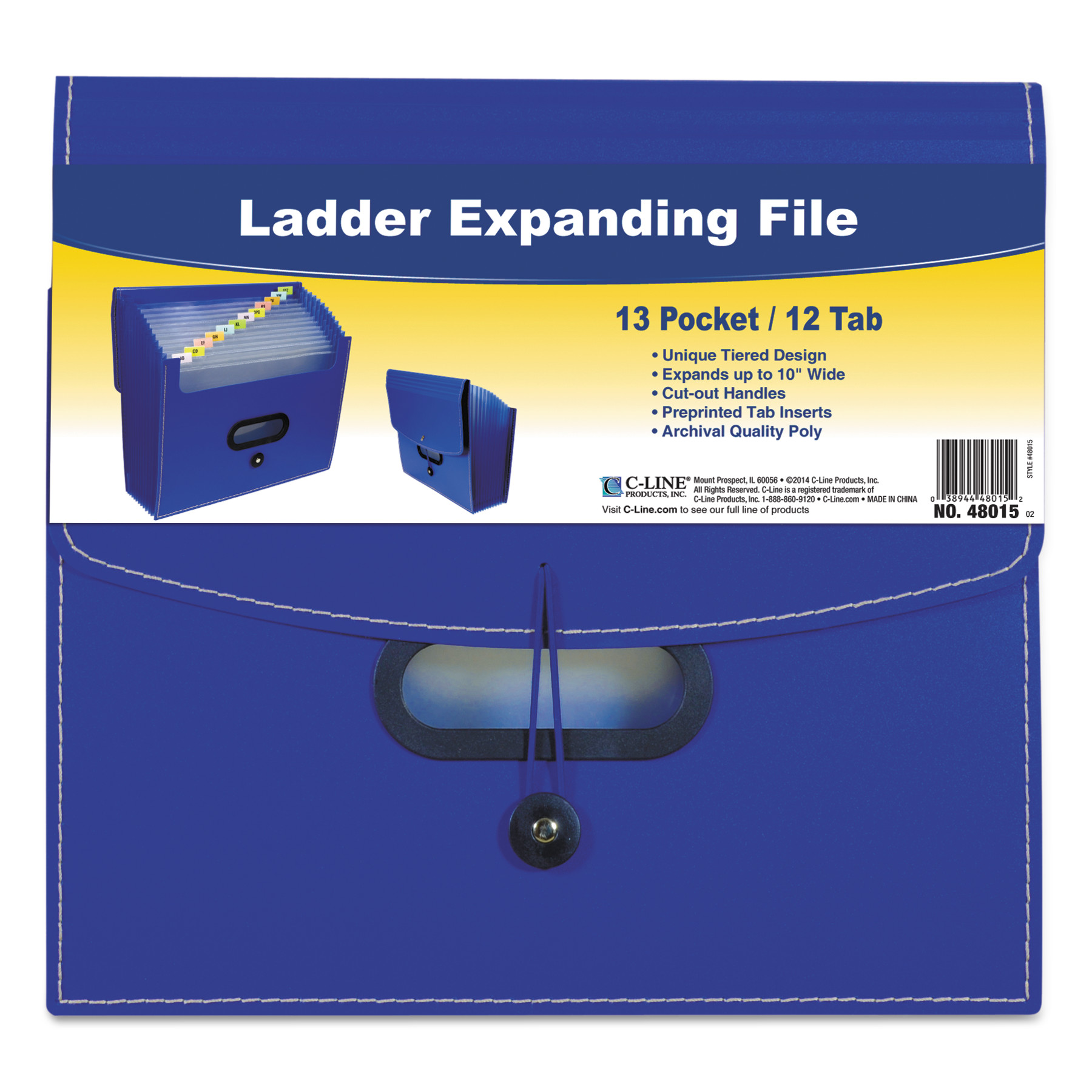 Ladder Expanding File features unique tiered design that allows for easier access to important papers and documents. Features extra durable, rigid poly construction and attractive exterior finish. Includes elastic string and double button closure that allows security flap to stay in place when in both the open or closed positions. 13 pockets expand to hold important materials. 12 dividers with pre-printed tab inserts. Cut-outs on front and back make for easy transport. Expands up to 10" to hold up to 1,000 sheets of paper. For letter size document storage. Blue with contrast stitching.