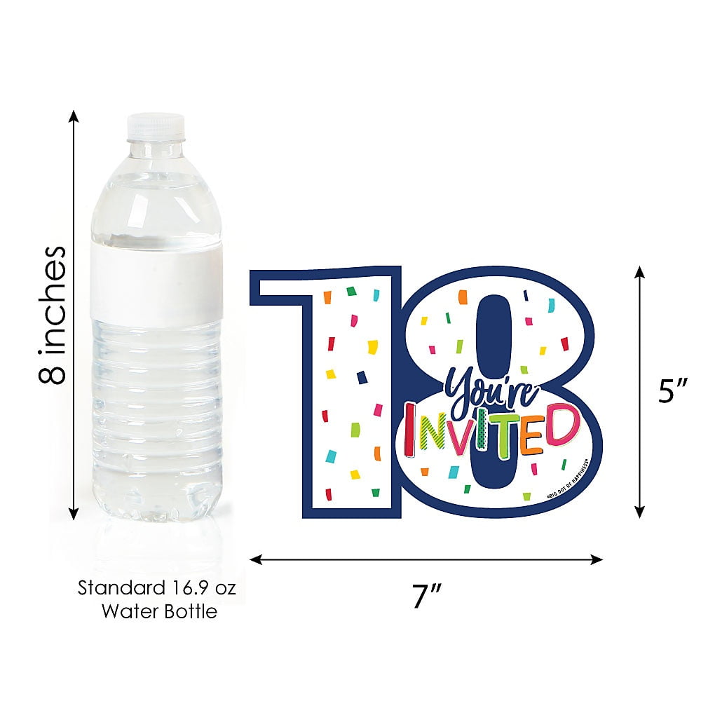- 18th Birthday – Cheerful Happy Birthday Fill-In the Blank Invitation Set INCLUDES 12 eighteen shaped party invitations and 12 premium white envelopes. 18th Birthday – Cheerful Happy Birthday fill-in invitation is perfect for any event. The rainbow theme is great for a birthday party.