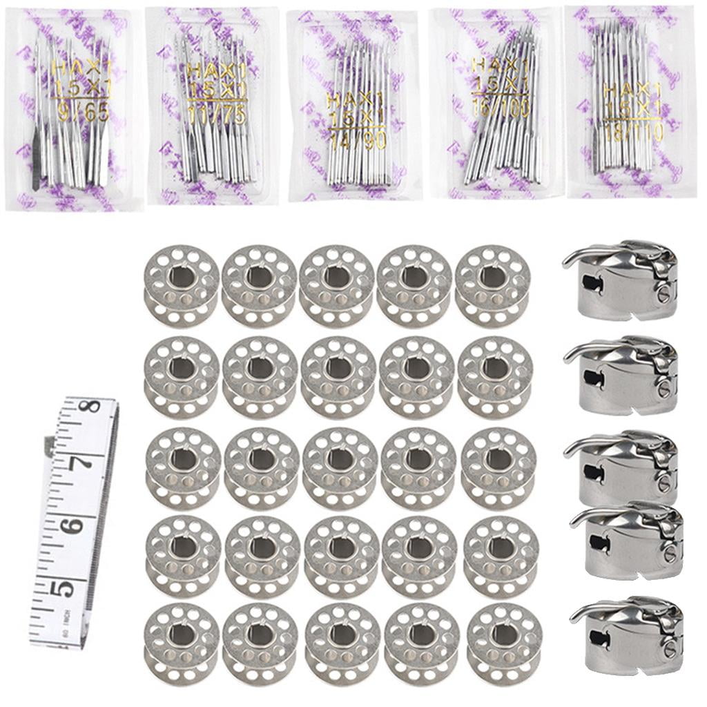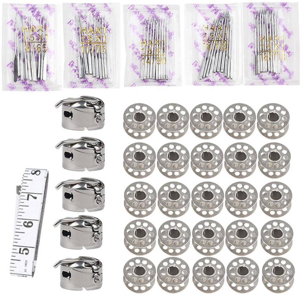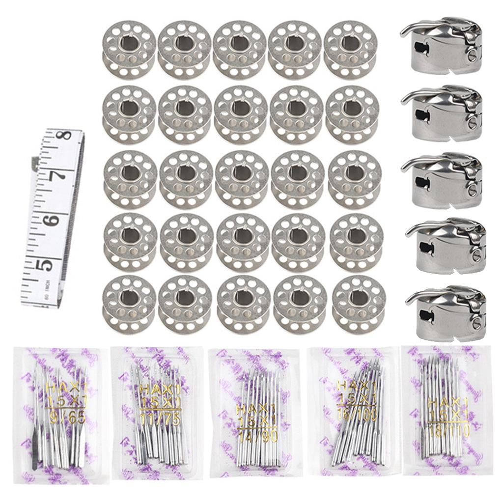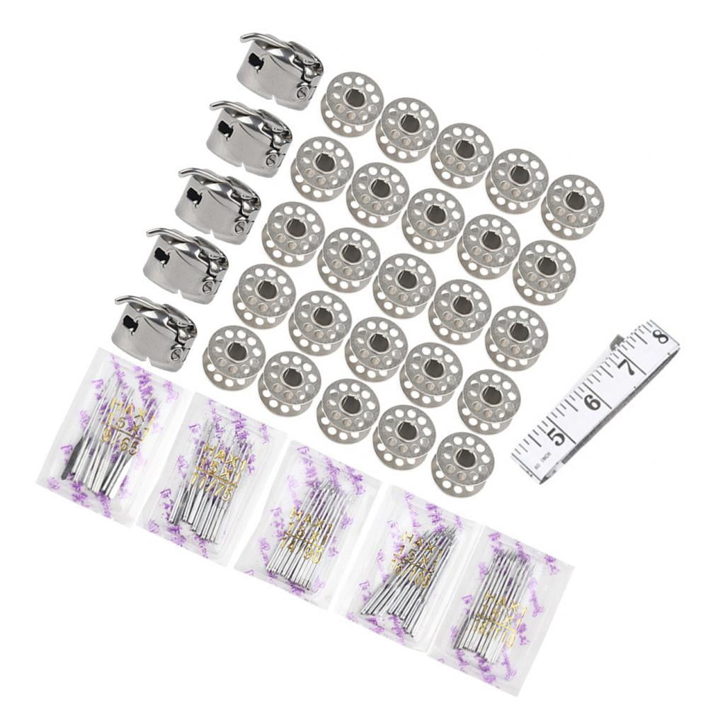 Set Includes: Sewing Machine Bobbin Case, 50 Home Sewing Machine and 25 Thread Bobbins, 1 1.5m/60inch Tape Measure.