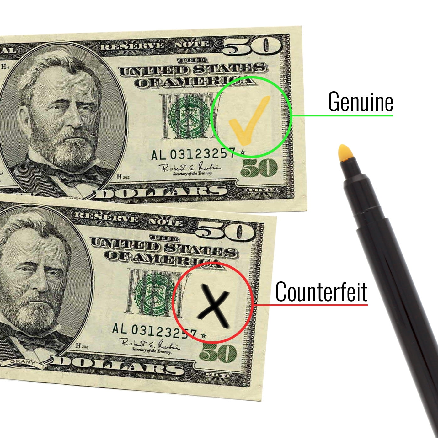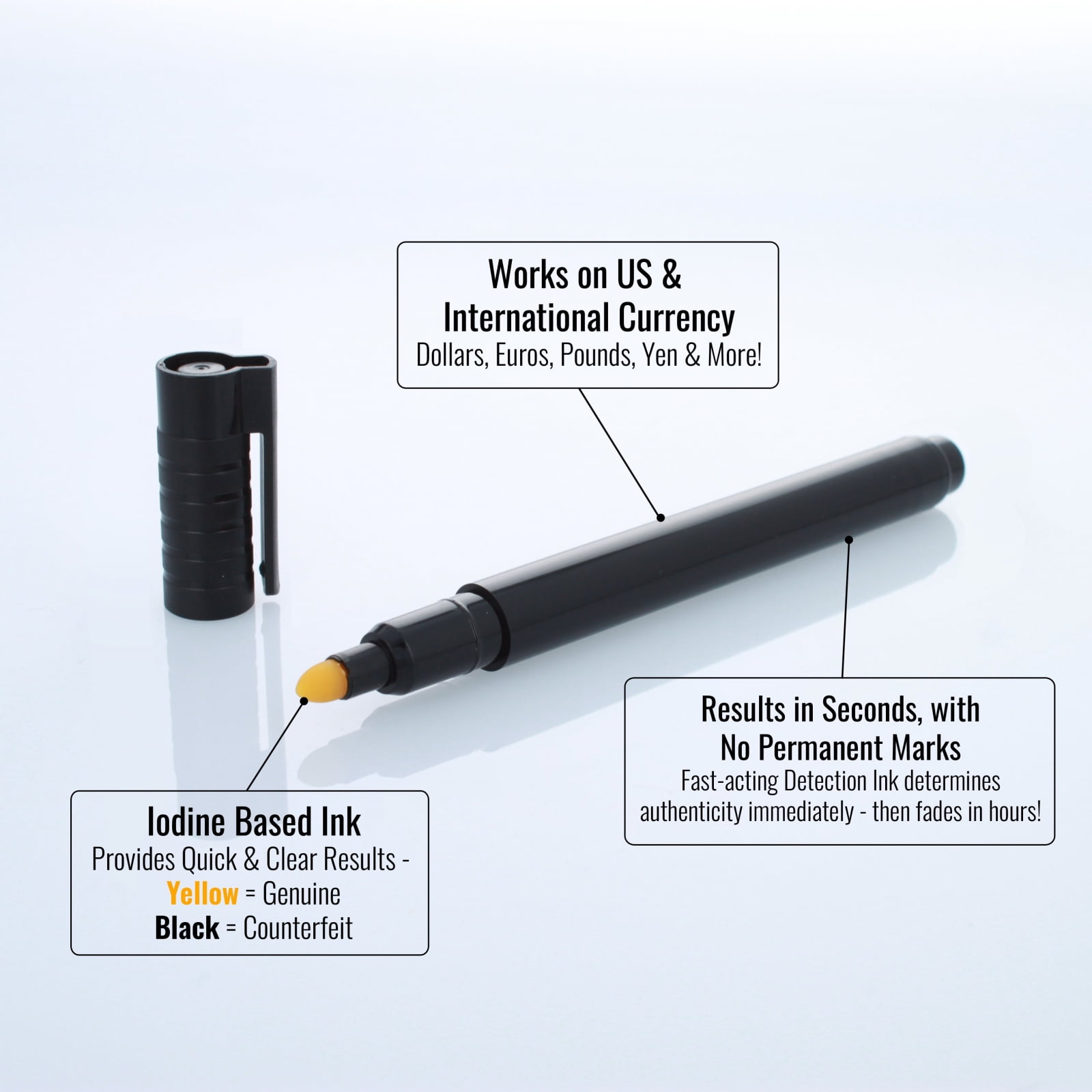 - COUNTERFEIT DETECTION INK – Filled with Iodine-based Ink Designed to Determine Currency Authenticity | Yellow Mark = Real, Black Mark = Counterfeit
