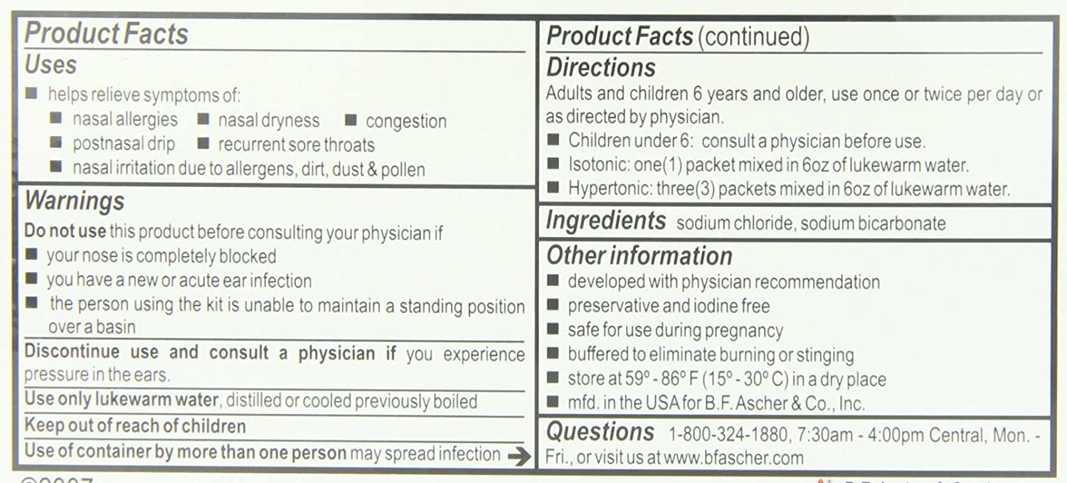 Ayr – helps you breathe better. Use once or twice per day or as directed by physician. Children under 5: consult a physician before use. Uses: Helps relieve symptoms of: nasal allergies; nasal dryness; congestion; postnasal drip; recurrent sore throats; nasal irritation due to allergens, dirt, dust and pollen. Preservative free, latex free and iodine free. pH balanced – no burning or stinging. Convenient, pre-mixed packets. Buffered to neutral pH. Safe for use during pregnancy. Developed with physician recommendation. Contains: 100 one-time-use sinus rinse mixture packets. Do not use this product if: nose is completely blocked; you have an acute or new ear infection; user is unable to stand up in a position near the sink.