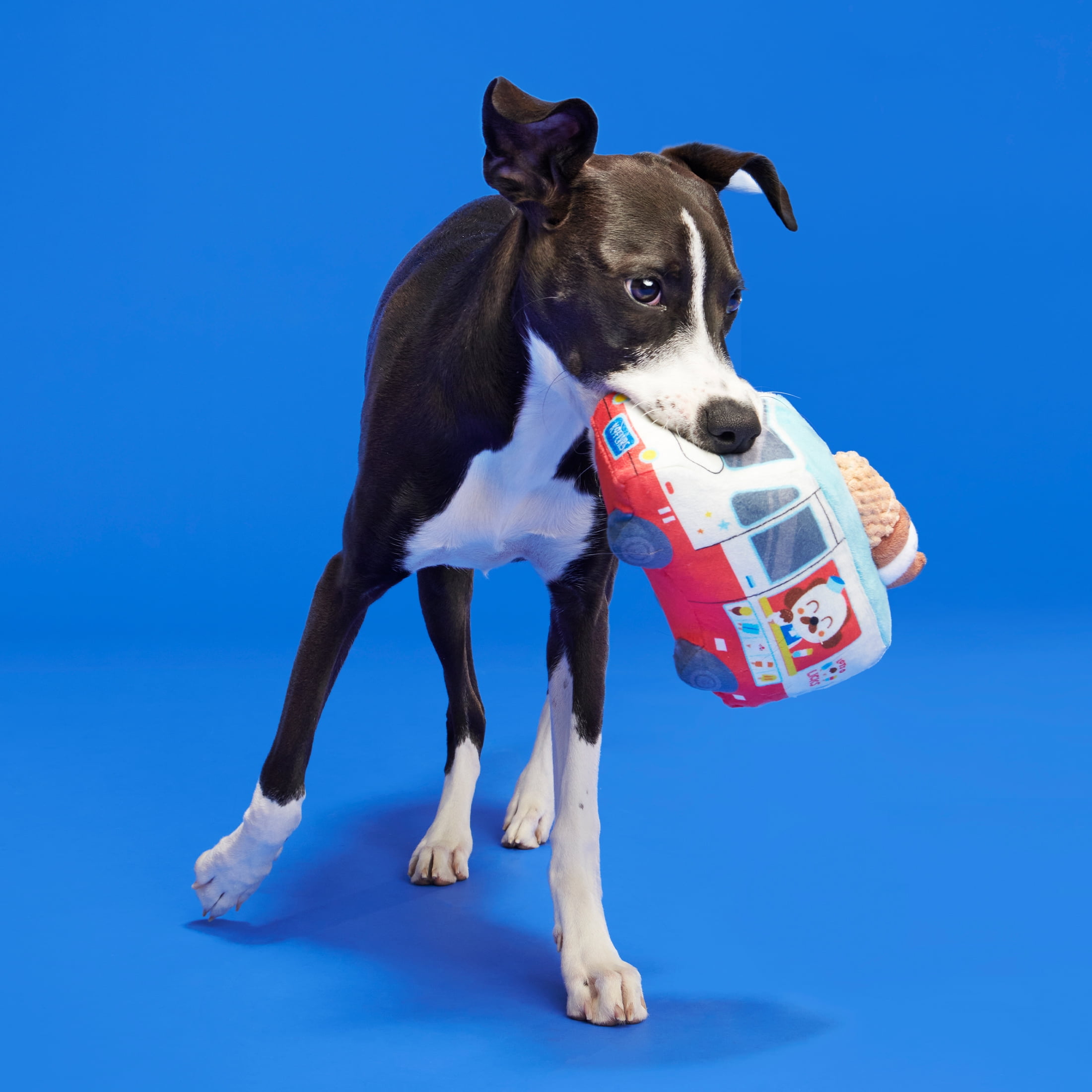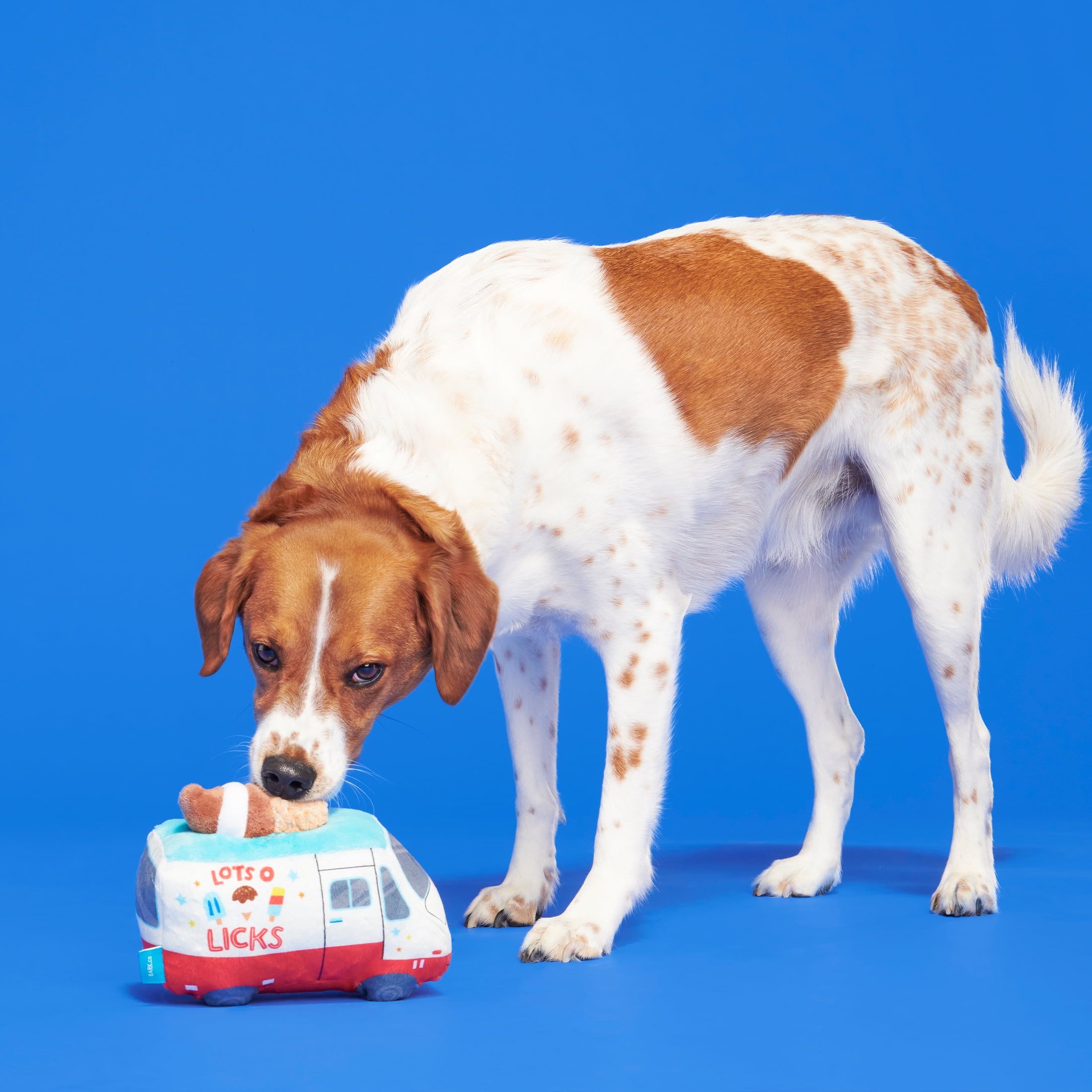 This ice cream truck dog toy is worth the chase! Lots O Licks Truck is fully stocked with fluff and features a booming tube squeaker, so you’ll hear it rolling in from a mile away! We all bark for ice cream! This BARK original toy is part of our Yankee Doodle Dogs collection, which we salute, one nation under dog. Made by dog people, for dogs and their people, backed by BARK’s Happiness Guarantee.