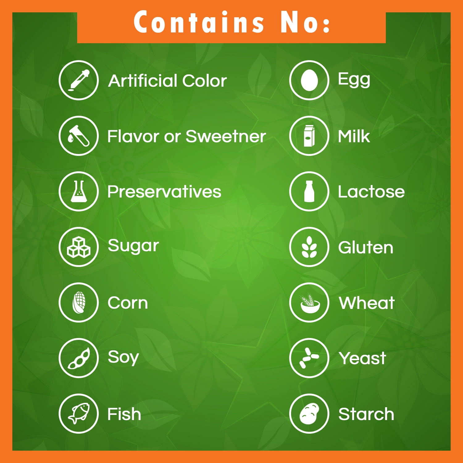 - No Artificial Color, Flavor or Sweetener, No Preservatives, No Sugar, No Starch, No Corn, No Soy, No Egg, No Lactose, No Gluten, No Wheat, No Yeast, No Fish, No Sodium.