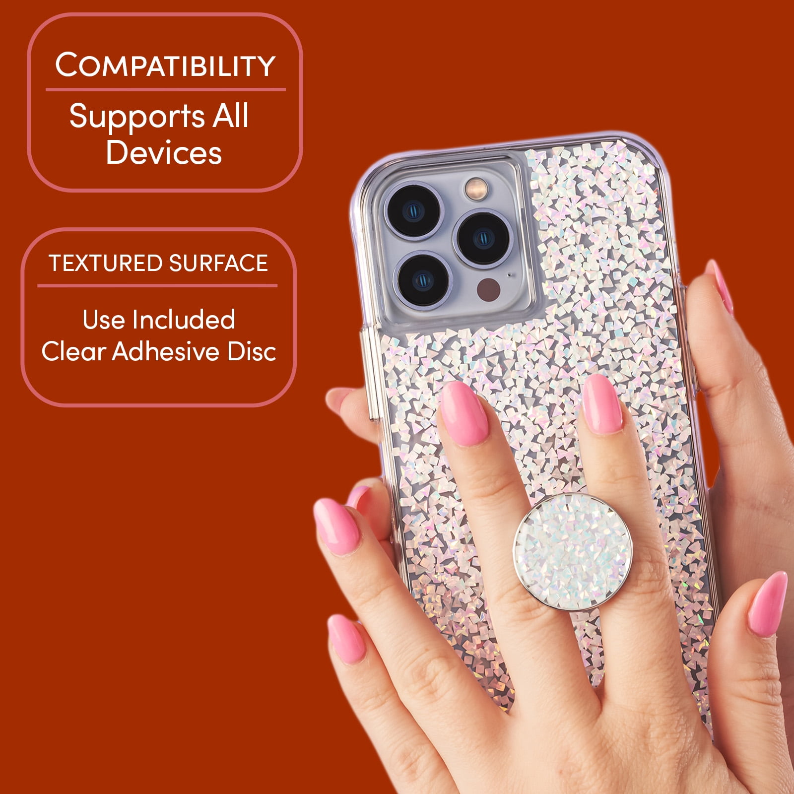 - Clear adhesive disc included for use on porous surfaces and textured cases