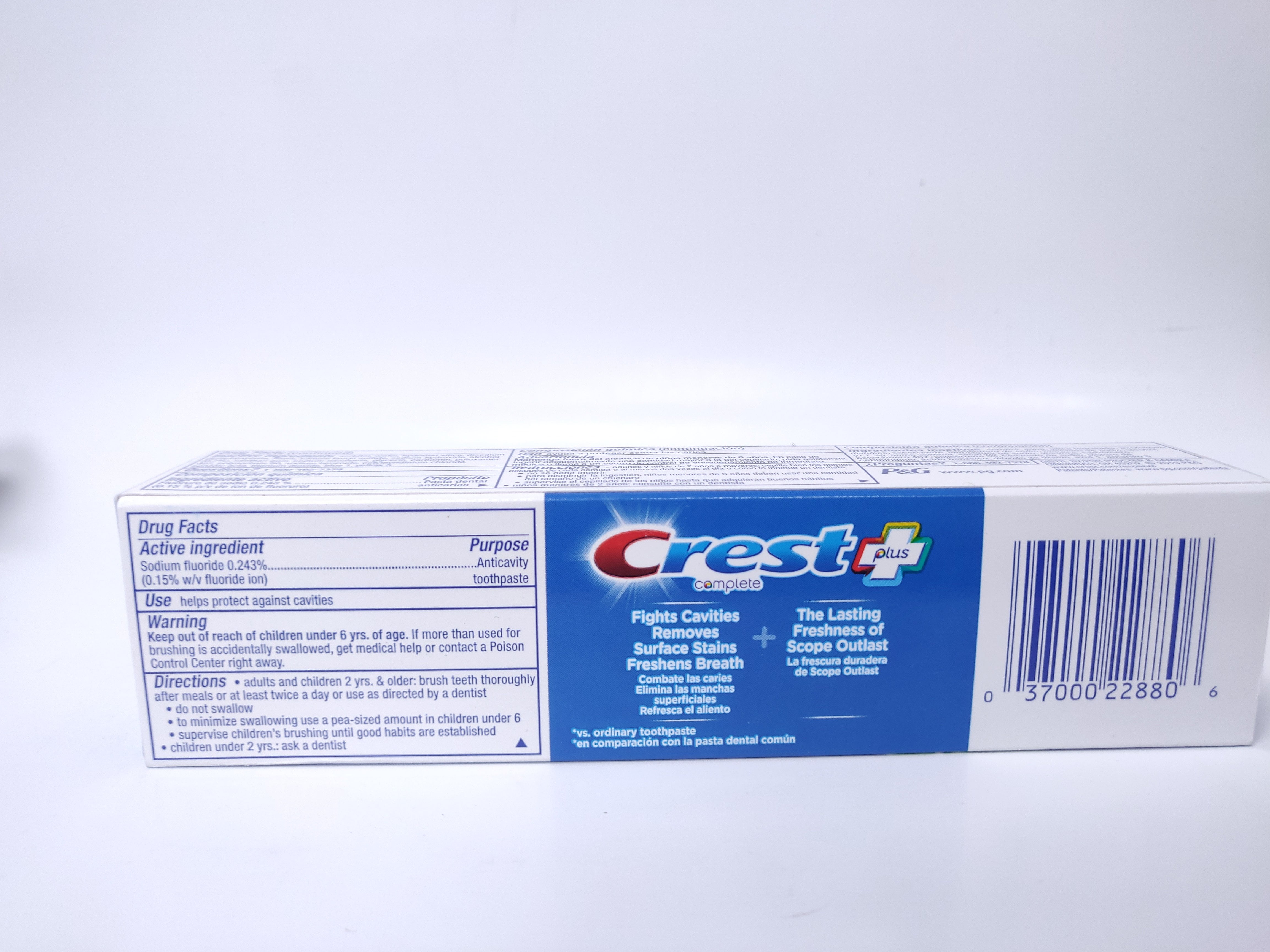 Healthy, beautiful smiles for life.ToothpasteP & G-HealthActive Ingredients:Sodium Fluoride 0.243%Adults and children 2 yrs and older: Brush teeth thoroughly after meals or at least twice a day or use as directed by a dentist. Do not swallow. To minimize swallowing use a pea-sized amount in children under 6. Supervise children’s brushing until good habits are established. Children under 2 yrs.: ask a dentist.Inactive Ingredients:Sorbitol; Water; Hydrated Silica; Disodium Pyrophosphate; Flavor; Sodium Lauryl Sulfate; Sodium Hydroxide; Alcohol (0.7%); Xanthan Gum; Sodium Saccharin; Glycerin; Carbomer; Poloxamer 407; Polysorbate 80; Sodium Benzoate; Cetylpyridinium Chloride; Benzoic Acid; Polyethylene; Mica; Titanium Dioxide; Iron Oxide; Blue 1; Yellow 5; Blue 1 Aluminum Lake; Yellow 10 Aluminum LakeUses:Helps protect against cavities. Extra whitening with cleaning action to help prevent tartar build-up and remove surface stains. Scope Long Lasting Freshness: Contains Scope Outlast technology to keep your breath feeling fresh even longer (vs ordinary toothpaste).Keep out of reach of children under 6 yrs of age. If more than used for brushing is accidentally swallowed, get medical help or contact a Poison Control Center right away.Healthy, beautiful smiles for life.ToothpasteP & G-HealthActive Ingredients:Sodium Fluoride 0.243%Adults and children 2 yrs and older: Brush teeth thoroughly after meals or at least twice a day or use as directed by a dentist. Do not swallow. To minimize swallowing use a pea-sized amount in children under 6. Supervise children’s brushing until good habits are established. Children under 2 yrs.: ask a dentist.Inactive Ingredients:Sorbitol; Water; Hydrated Silica; Disodium Pyrophosphate; Flavor; Sodium Lauryl Sulfate; Sodium Hydroxide; Alcohol (0.7%); Xanthan Gum; Sodium Saccharin; Glycerin; Carbomer; Poloxamer 407; Polysorbate 80; Sodium Benzoate; Cetylpyridinium Chloride; Benzoic Acid; Polyethylene; Mica; Titanium Dioxide; Iron Oxide; Blue 1; Yellow 5; Blue 1 Aluminum Lake; Yellow 10 Aluminum Lake Uses:Helps protect against cavities. Extra whitening with cleaning action to help prevent tartar build-up and remove surface stains. Scope Long Lasting Freshness: Contains Scope Outlast technology to keep your breath feeling fresh even longer (vs ordinary toothpaste).Keep out of reach of children under 6 yrs of age. If more than used for brushing is accidentally swallowed, get medical help or contact a Poison Control Center right away.