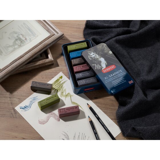 Create a wide variety of textures and effects with these XL graphite blocks; enjoy subtle blending, create fine lines and explore deep tonal work. These chunky blocks are fun and intuitive to use, and create a wide array of lines, effects and tones. Set colors include Olive Green, Dark Prussian, Raw Umber, Burnt Umber, Soft Graphite, Very Soft Graphite.