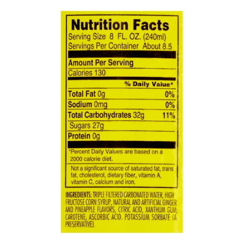 "Low fat Low sodium Ingredients: Triple Filtered Carbonated Water, High Fructose Corn Syrup, Artificial Pineapple Flavor, Citric Acid, Sodium Benzoate (A Preservative), Artificial Color (FD&C Yellow #5) And Brominated Vegetable Oil."D & G Jamaican Soda, Pineapple, 67.6 Fl Oz, 1 Ct