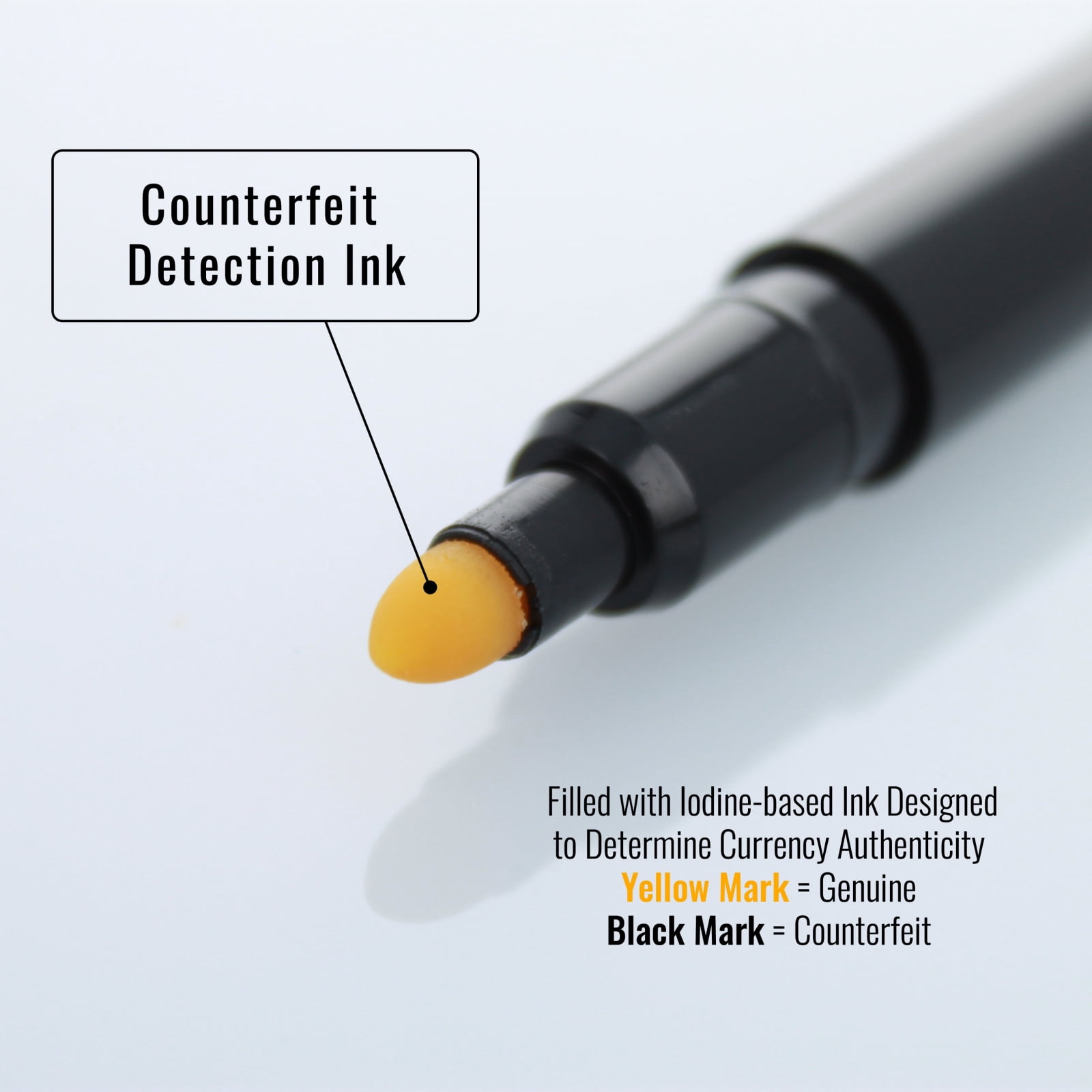 Highly effective and inexpensive tool for detecting bad bills. Simply make a small mark on U.S. currency. Chemically sensitive ink works instantly. An amber mark passes the test, while a dark brown or black mark means the bill is probably counterfeit. Works on all new design U.S. currency (bills series 1959 and later). Includes reusable UV-LED light cap to check UV security threads. Works on U.S. and most foreign currency, passports, cashier’s checks and money orders. Counterfeit Bill Detector Type: Pen; Marking Color: Amber; Counterfeit Indication Mark: Black;Dark Brown.- SKU: AZERTY12129