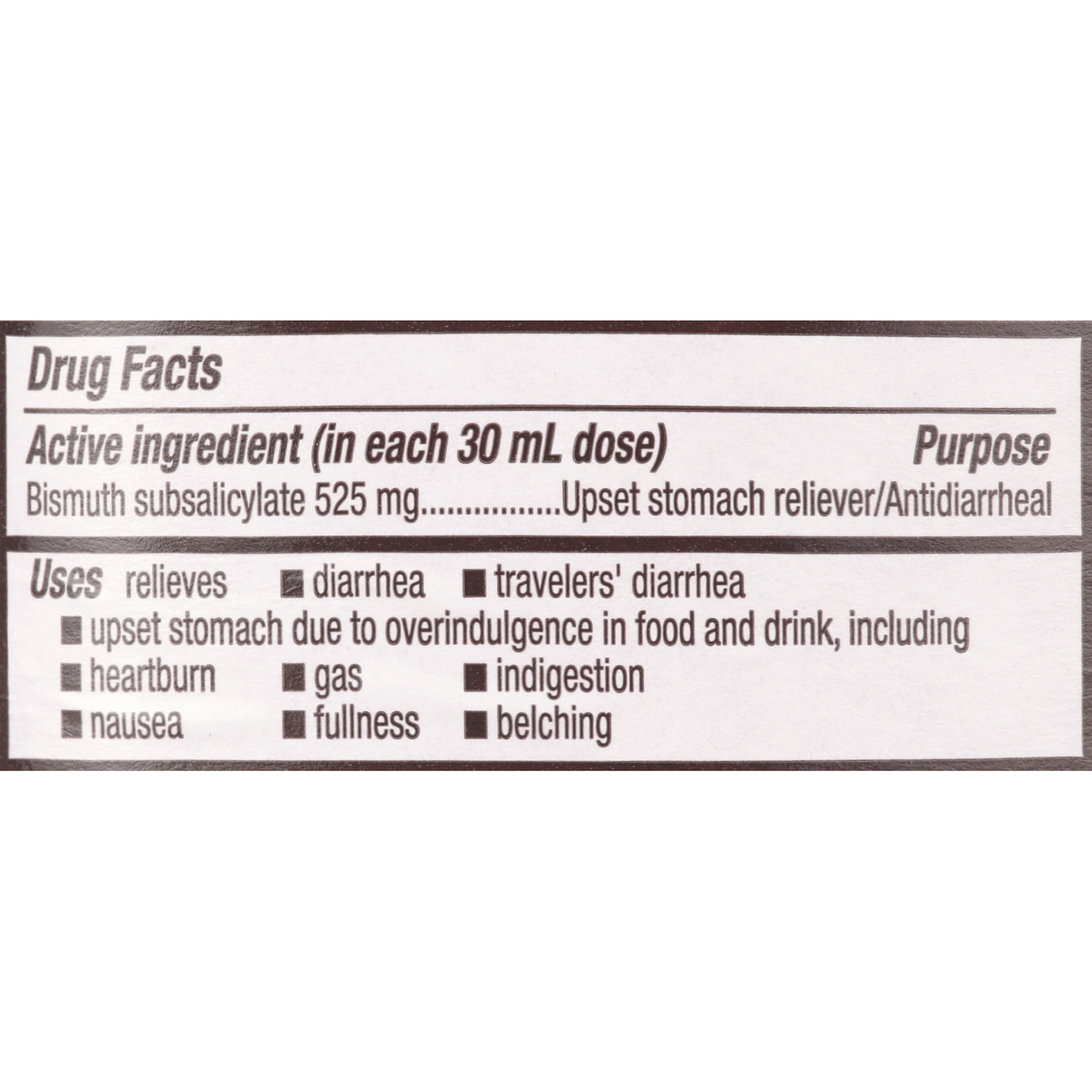 - Active ingredient (in each 30 mL dose): Bismuth Subsalicylate 525 mg