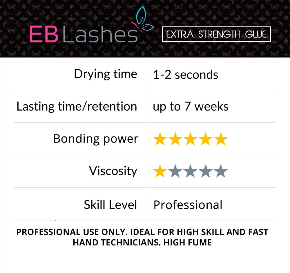 ★FOR PROFESSIONAL USE ONLY!!!! This eyelash extension glue is for professional lash artists only! if you are not a professional lash artist who uses this glue to apply to clients eyelashes, please DO NOT purchase. This Glue should NEVER EVER be used for self application. If you are not a professional and have already purchased this glue, please return it and we will gladly issue a FULL REFUND.EB Lashes Extra Strong Eyelash Extension Glue Adhesive For Professional Or Experienced Lashers For Individual EyeLash Extensions: Drys in 1-2s with 6-7 Week Retention 5ml