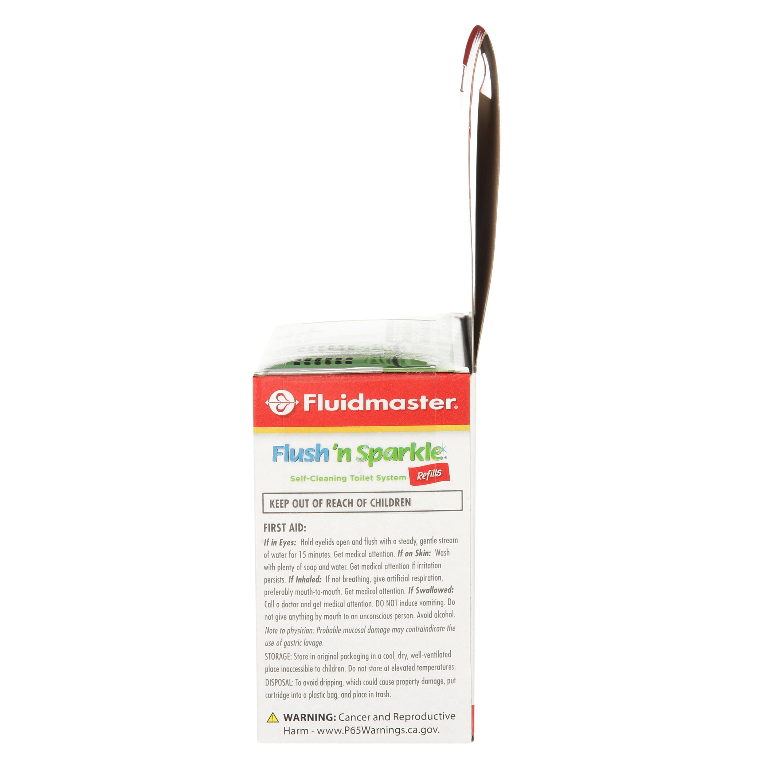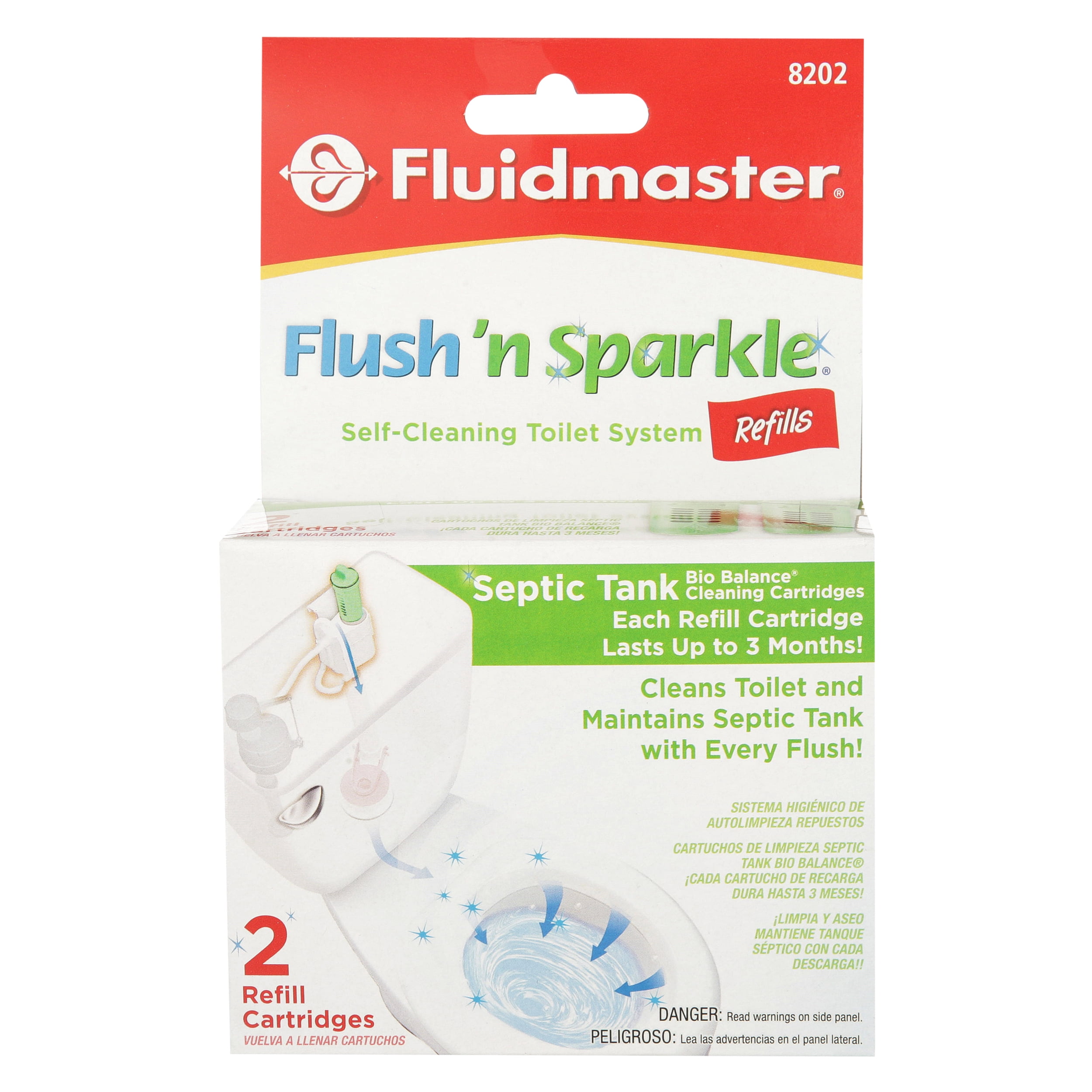 The Fluidmaster 8202P8 Flush ‘n Sparkle Automatic Toilet Bowl Cleaning System Septic Refill Cartridges 2-Pack are designed for simple and effective hands-free cleaning for most toilets with every flush. Flush ?n Sparkle? Septic Refill Cartridges are made to quickly replace old cartridges and fit both the Bleach, or Blue Systems. Installation is easy and takes only a minute, for continued hassle-free cleaning. The Flush ?n Sparkle? Septic Cleaning System puts a powerful Bio Balance cleaning solution directly into the overflow tube of the flush valve, so no chemicals ever touch the flapper, fill valve, or other tank parts. Help maintain your septic tank and prevent the damage drop-in tablets normally inflict, leading to deterioration and part malfunction. The Flush ?n Sparkle? Cleaning System Refills offer a powerful toilet cleaning solution, in a 2-Pack for up to 6 months of cleaning.
