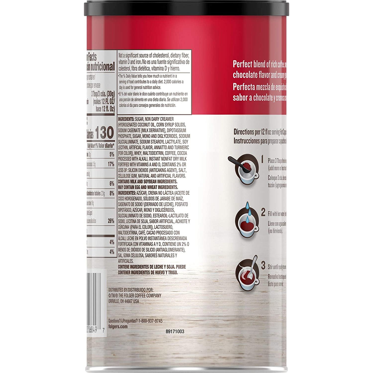 Coffee and chocolate—no two flavors belong together more. Chocolaty sweetness and hardy coffee unite to create a decadent cup of Folgers Mocha Chocolate Flavored Cappuccino. Can be used as a creamer in your regular coffee.