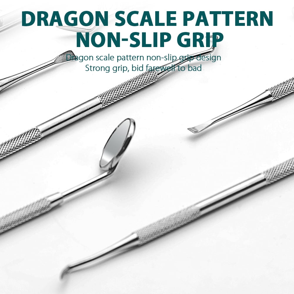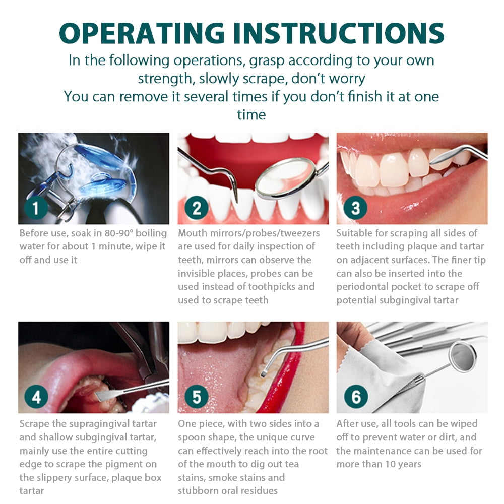 This 7-pack dental tools set includes all-types dental scraper kit, stomatoscope, dental stain-eliminator, tweezers, probe, sickle scaler, hoe-shaped scaler.