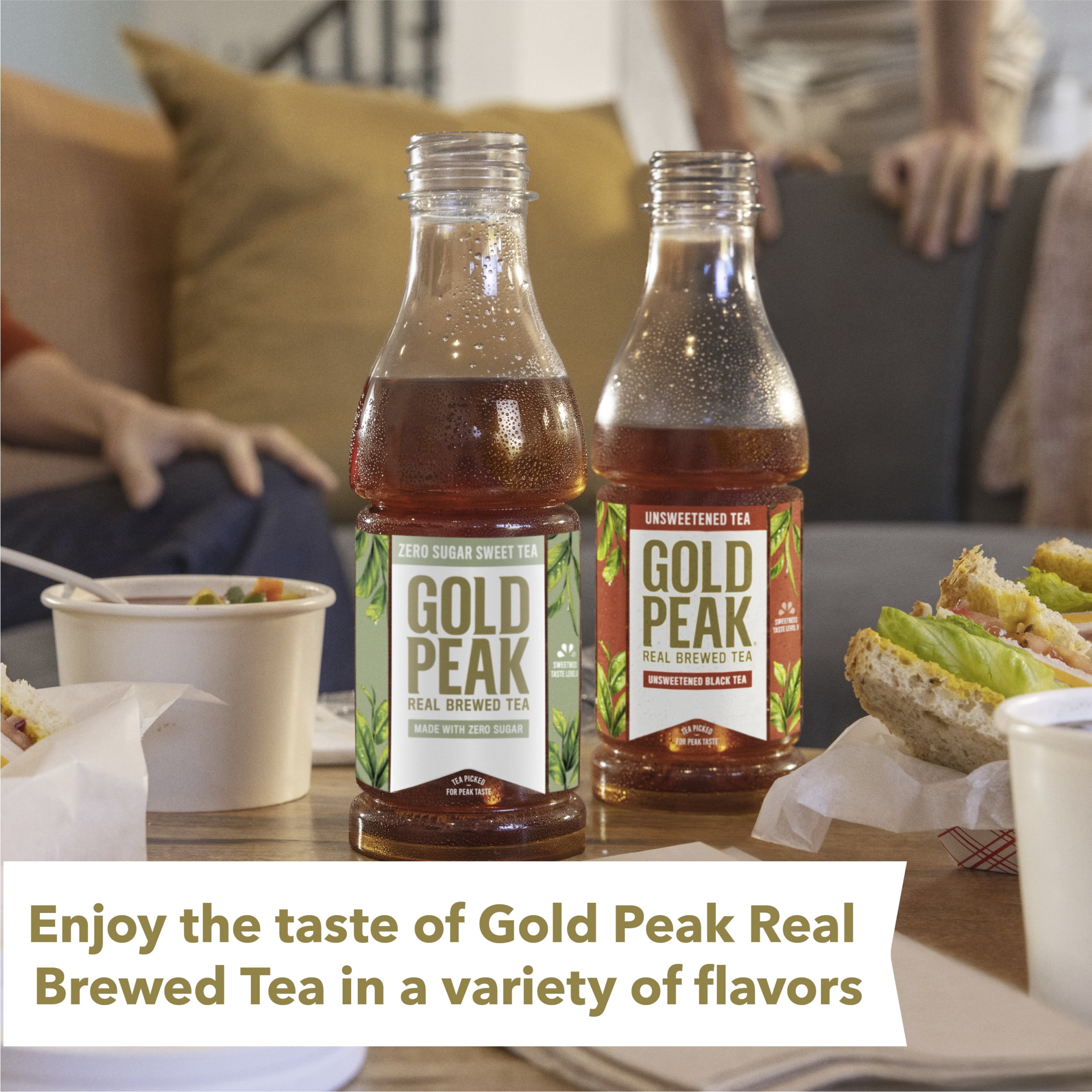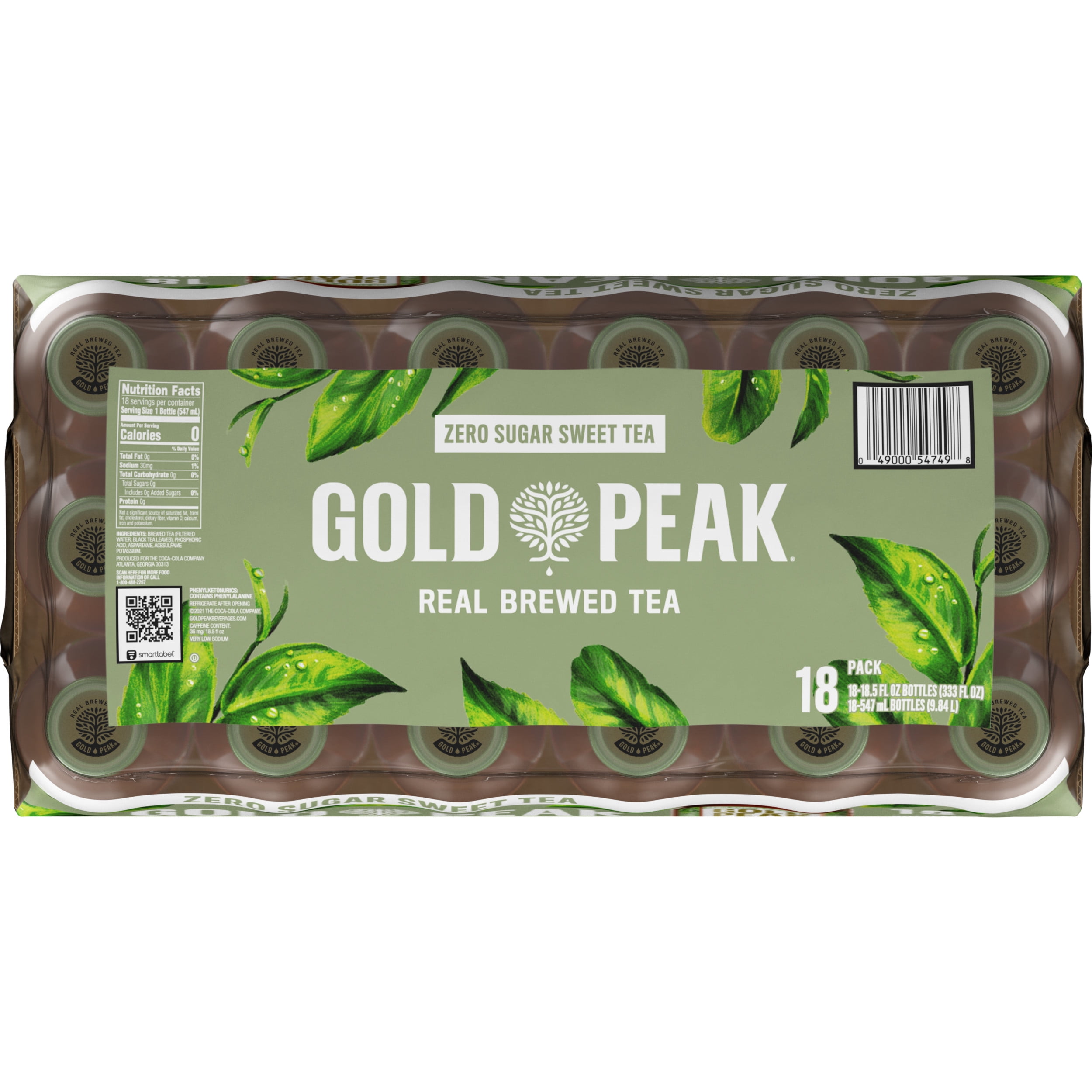 Gold Peak Zero Sugar Sweet Tea, 16.9 fl oz, Pack of 18 Bottles. Gold Peak is real brewed tea made from tea leaves picked for peak taste. Enjoy the zero-calorie option, Gold Peak Zero Sugar Tea. This tea is bursting with refreshingly natural flavors. Perfect for the whole family, these convenient bottles let you take real brewed tea wherever you go. Whether it?s a picnic in the park, watching the game or a backyard barbeque, get that delicious fresh-brewed flavor with every sip. Gold Peak Zero Sugar Tea is a zero-calorie tea that uses pure filtered water for a difference you can taste. Gold Peak has a variety of real brewed flavors that pair marvelously with any occasion, from unplanned get-togethers to holiday traditions. And the fresh flavor makes any meal feel like home cooking, whether it?s lunch on-the-go or family takeout night, Gold Peak?s real taste will match those real moments. There?s a variety of Gold Peak Teas to choose from, whether you like zero-sugar teas, sweetened real brewed teas or unsweetened real brewed tea options. We have a collection of classic flavors like Gold Peak Lemon Tea, Gold Peak Green Tea and Gold Peak Lemonade Tea and even offer refreshing flavors that are available nationally, like California Raspberry Tea and Georgia Peach Tea. Real Brewed. Real Tea. Real Good.