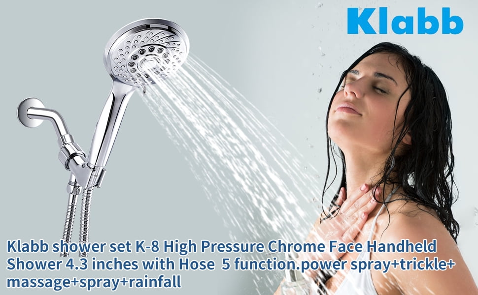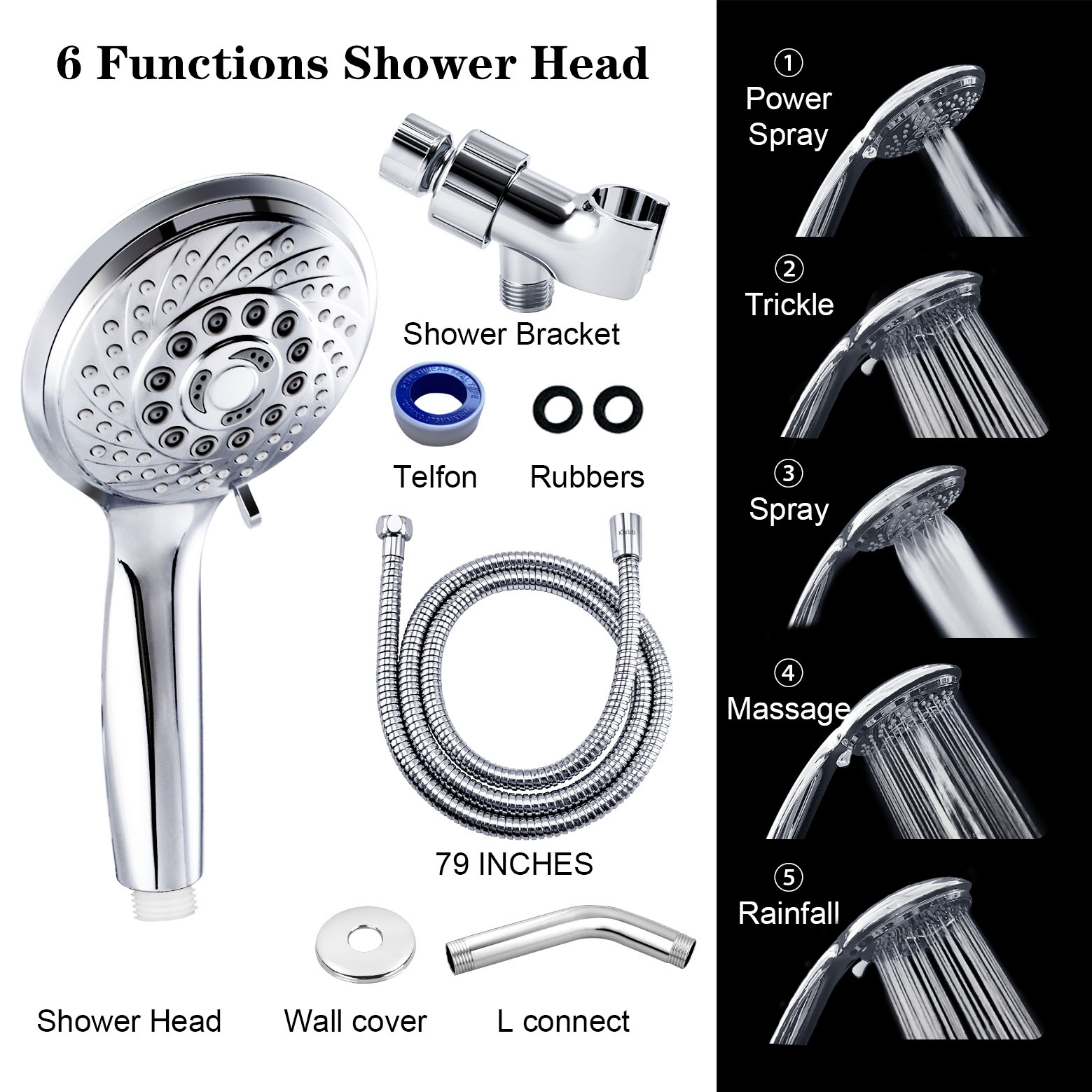 1. 4.3 inches Deluxe 5 functioin hand shower: Can be used as Overhead or Handheld shower, High-power Click Lever Dial, power spray+rainfall+trickle+spray+massage.all chrome finish including face 2.Adjustable SS connect tube and bracket: extra longer 79 inches flexible reinforced stainless steel hose with one more teflon. High-Quality Materials: Chrome plated Durable 3.ABS material, a solid brass adjustable swivel ball joint and stainless steel hose make the shower head set light, high strength and rustproof 4.Easy Installation: Installs in minutes with just one hand-tightened connection. Universal G1/2” threads fitting to any standard shower pipe, arm 5.Please contact us if you have any question or inquiry.we will answer you in 12 hours.