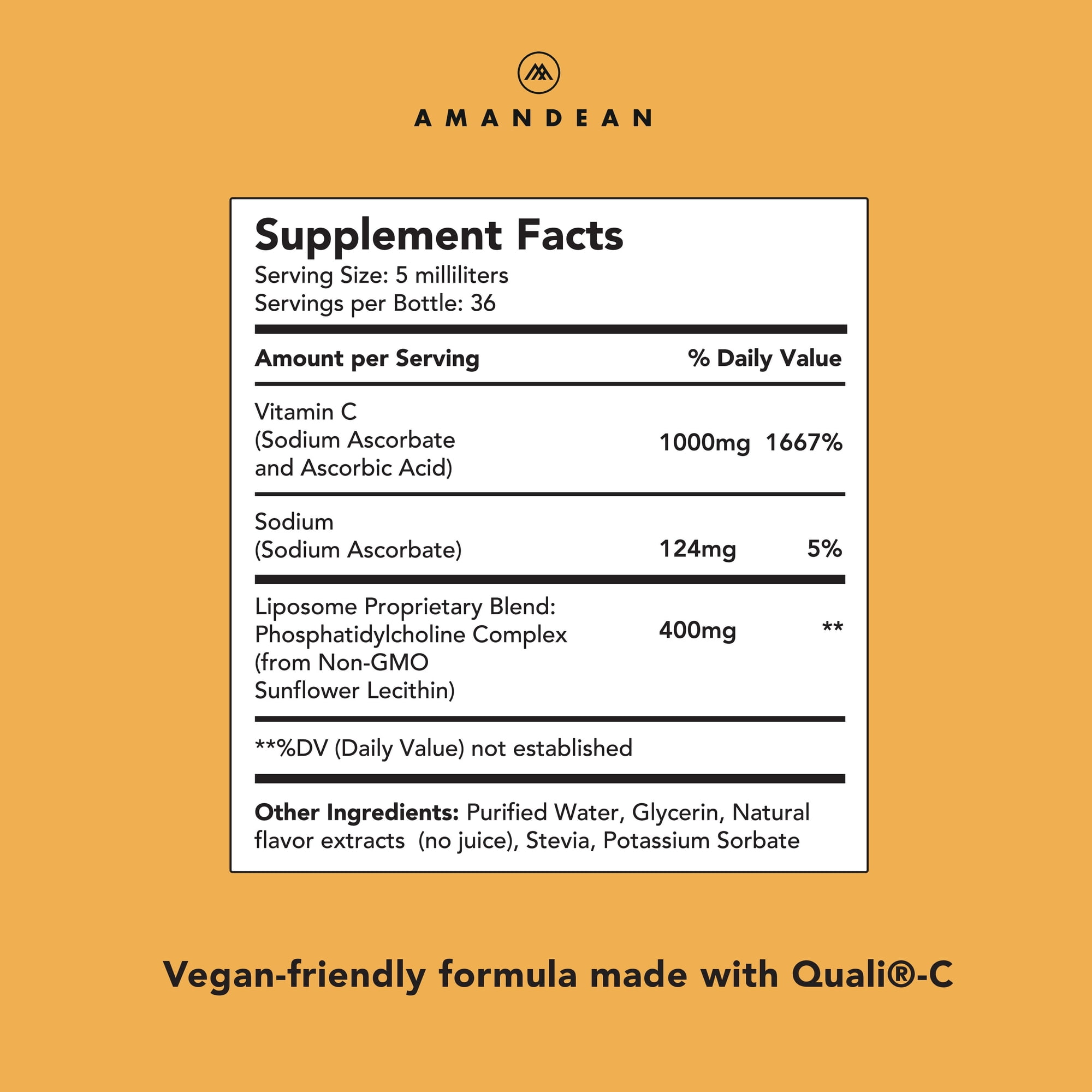 Did you know that the fastest, easiest and most efficient way of supplying your body with essential Vitamin C is by choosing a Liposomal Vitamin C supplement? However, finding the healthiest, safest and most reliable Vitamin C supplement can be quite tricky. Until NOW! Introducing The Premium Natural Liposomal Vitamin C Dietary Supplement By Amandean! Strengthen your immune system, help boost the production of collagen in your body and support heart and skin health with the most natural, healthiest and fast absorbing Vitamin C supplement! Why Choose The Amandean Liposomal Vitamin C Supplement Over Other Alternatives? 20% Faster Absorption – we have used sunflower lecithin instead of soy or other ingredients in order to make sure that your body can absorb Vitamin C faster and more effectively! Ultra-Pure Water & Natural Orange Extract – our Liposomal Vitamin C liquid supplement contains only all natural ingredients plus it’s Sugar-Free, Soy-Free and Non-GMO! Feel Healthy & Energized – especially if you’re dealing with stress and fatigue, your body needs an extra layer of protection. Our Vitamin C supplement will do exactly that! USA-Made Formula – unlike other cheaply-made Vitamin C supplements, the Amandean Liposomal Vitamin C dietary supplement is made right here in the USA in our state-of-the-art facilities under strict health and safety guidelines! And The Best Part? If you’re not satisfied with our Liposomal Vitamin C supplement, then all you have to do is contact us and we’ll offer you a full refund! No questions asked! Click “Add To Cart” NOW & Enjoy The Unique Benefits Of Liposomal Vitamin C!