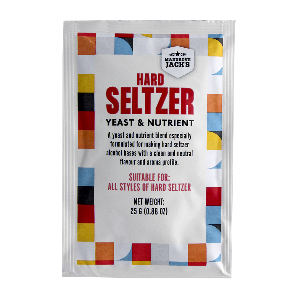 Mangrove Jack’s Hard Seltzer Yeast & Nutrient 25g – A yeast and nutrient blend specifically formulated for making hard seltzer alcohol bases with a clean and neutral flavor and aroma profile. For Fermentation of refined sugar washes for use in making hard seltzers. Suitable for approx. 19-23L fermentation volumes.Usage directions: Add directly to approx. 20L fermentation volume, stir well, and leave to ferment at 20-25 °C (68-77 °F) for optimum results. Store in a cool, dry place away from direct sunlight.