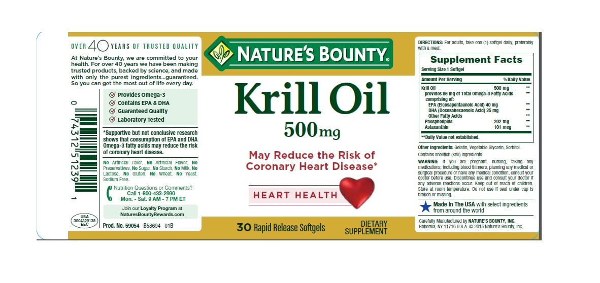 Heading Purpose Dietary Supplement Manufacturer Us Nutrition Active Ingredients 1 Softgel: (Percent Daily Values are based on a 2000 calorie diet) Calories 5 (Calories from Fat 5); Total Fat 0.5 g; Krill Oil 500 mg (*Daily Value not established) (Total Omega-3 Fatty Acids 95 mg (*) (EPA (Eicosapentaenoic Acid) 50 mg (*); DHA (Docosahexaenoic Acid) 27.5 mg (*); Other Fatty Acids (*)); Phospholipids 200 mg (*); Astaxanthin 100 mcg (*)); Gelatin; Vegetable Glycerin Directions For adults, take one (1) softgel daily, preferably with a meal. Uses Krill oil comes from small red-colored crustaceans called krill that are similar to shrimp. The omega-3 fatty acids in krill oil exists as the natural phospholipids found in krill. No artificial color, flavor or sweetener, preservatives, sugar, starch, milk, lactose, soy, gluten, wheat, yeast, or sodium. May reduce the risk of coronary heart disease* Rapid release liquid softgels. *Supportive but not conclusive research shows that consumption for EPA and DHA omega-3 fatty acids may reduce the risk of coronary heart disease. See nutrition information for total fat content. Warnings Contains shellfish (krill) ingredients. If you are pregnant, nursing, taking any medications, planning any medical procedure or have any medical condition, consult your doctor before use. Discontinue use and consult your doctor if any adverse reactions occur. Keep out of reach of children. Store at room temperature. hide
