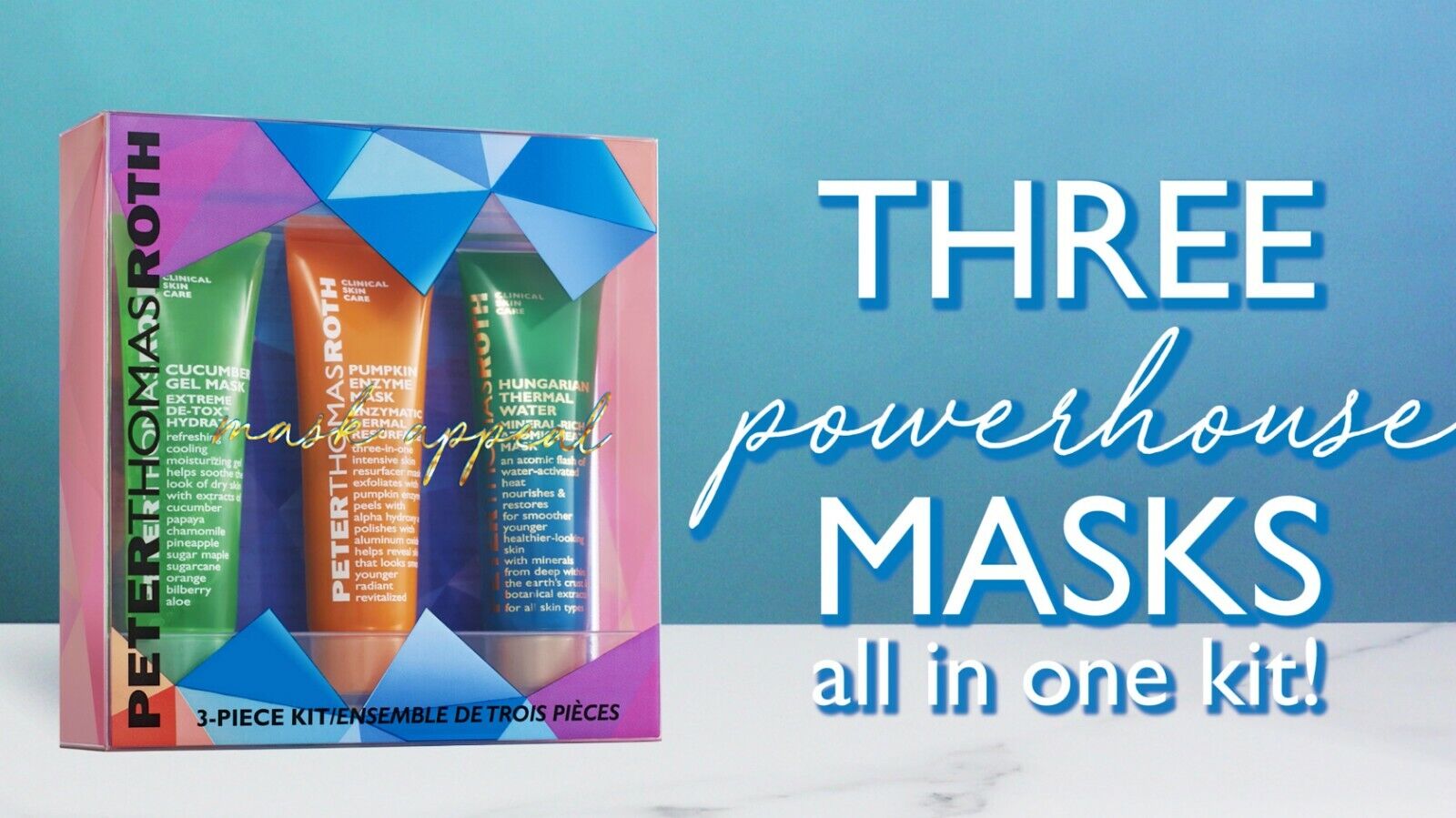 Everything you need to multi-mask like a pro, now in a new must-have kit! Features three of Peter s bestselling masks: Cucumber Gel Mask Extreme De-Tox Hydrator, Pumpkin Enzyme Mask Enzymatic Dermal Resurfacer and Hungarian Thermal Water Mineral-Rich Atomic Heat Mask. Each mask can be used separately or applied to targeted areas for the ultimate multi-masking experience.