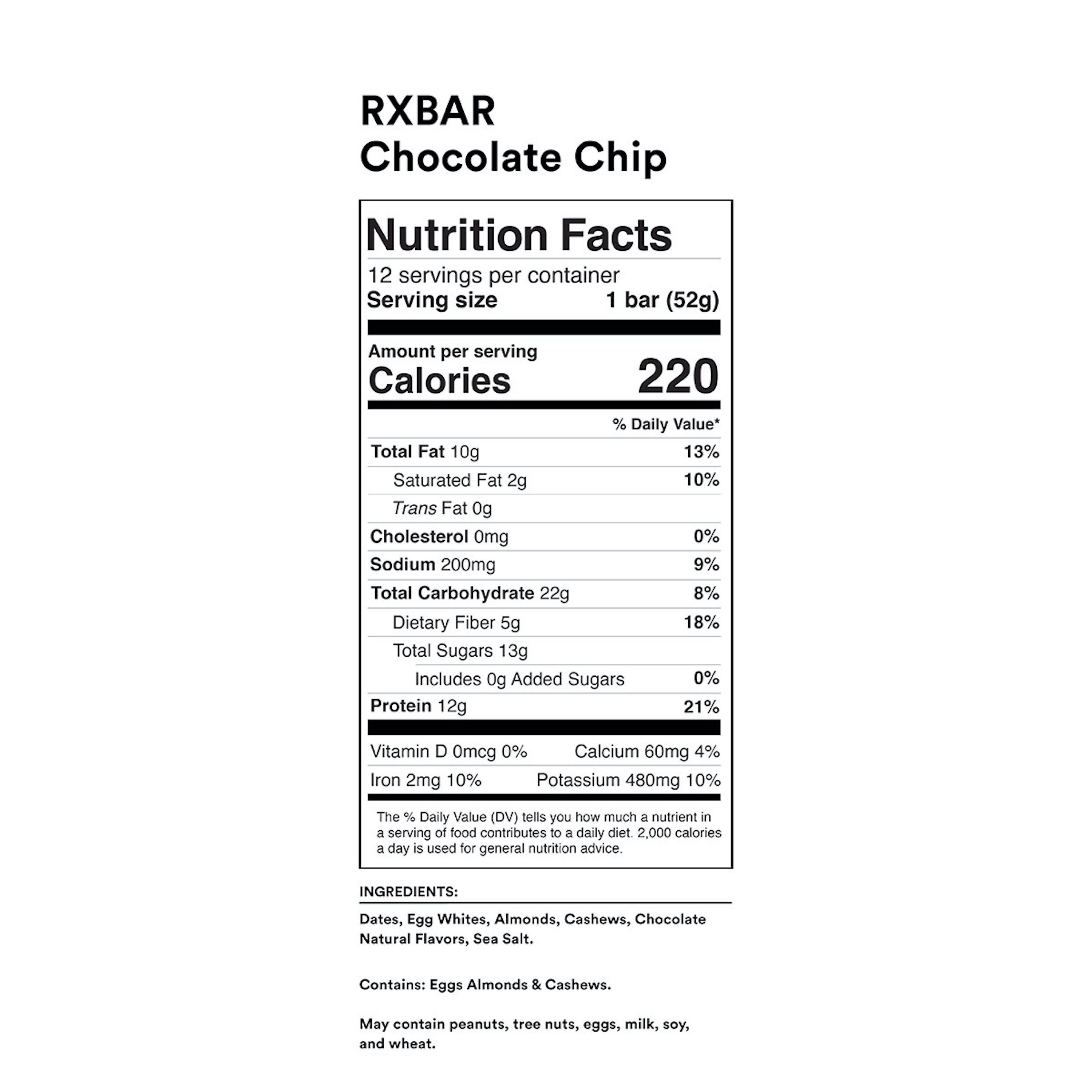 - ON-THE-GO PROTEIN SNACK FUEL: Chocolate Chip RXBAR is great for the office, an on-the-go snack, or just a wholesome treat.Grab one bar for a 12g protein pre or post workout snack and get the energy you need.