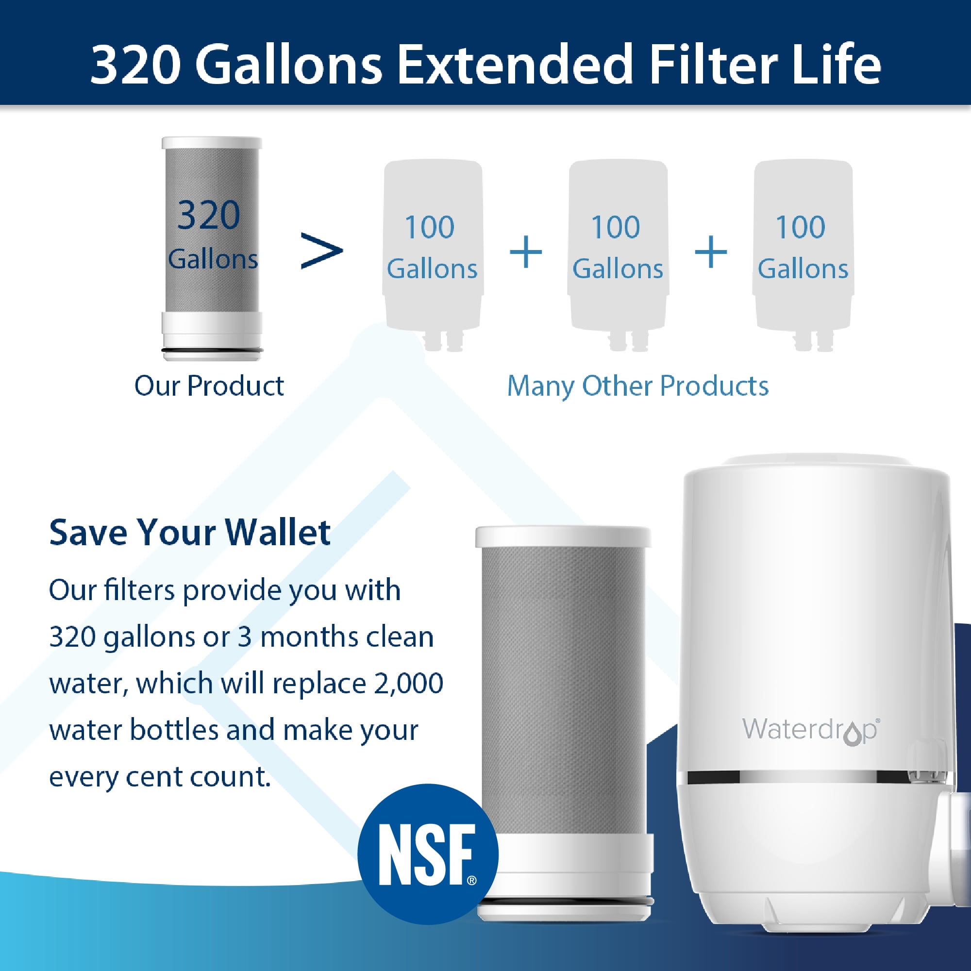 Our faucet water filter system offers 3 months or 320 gallons of clean water, which is more cost-effective.