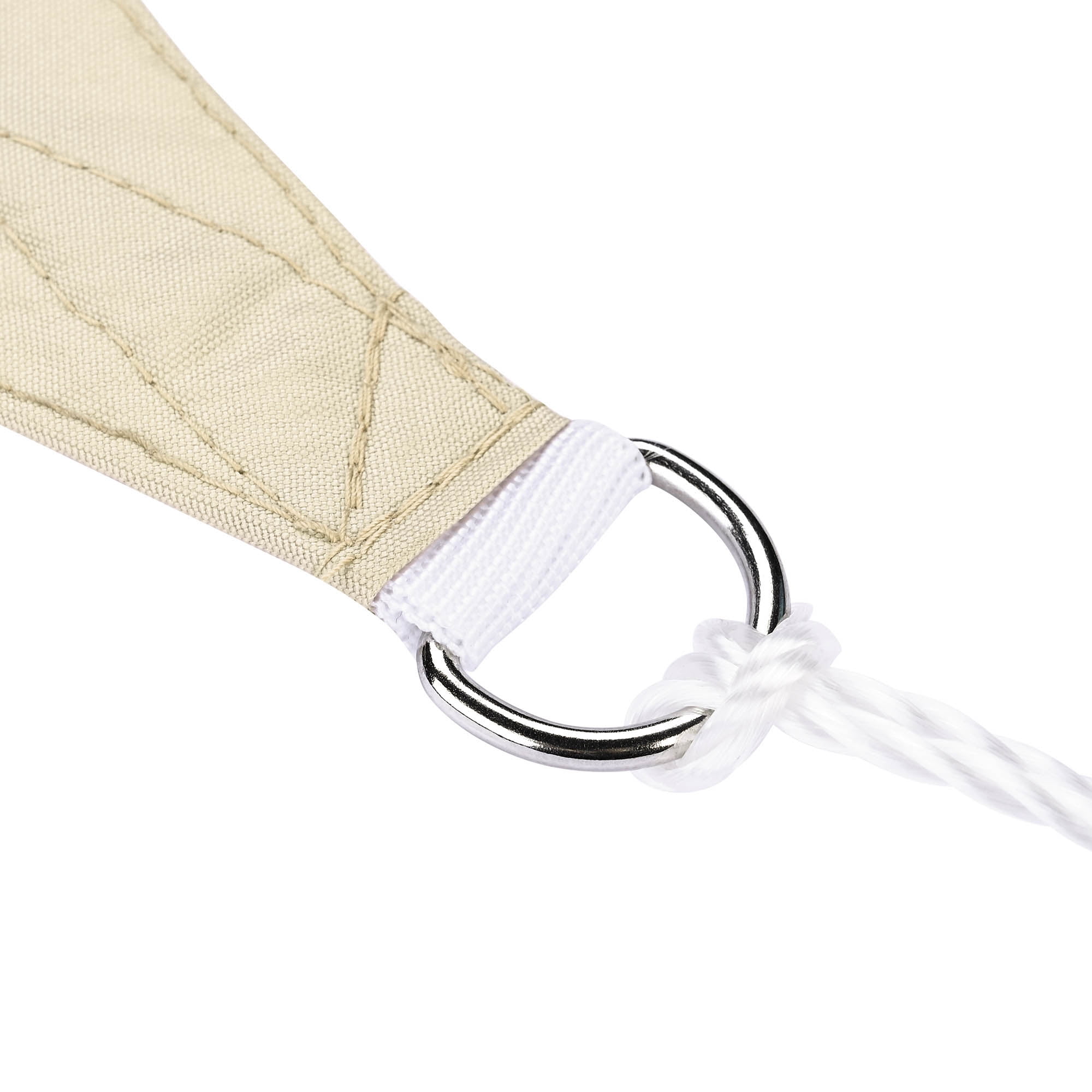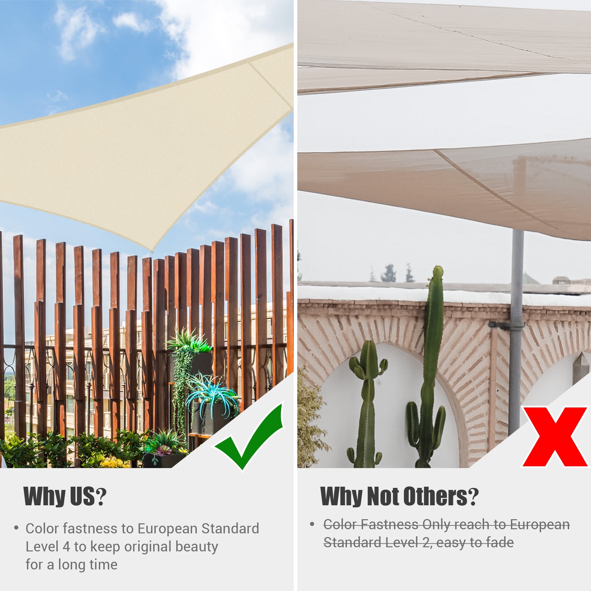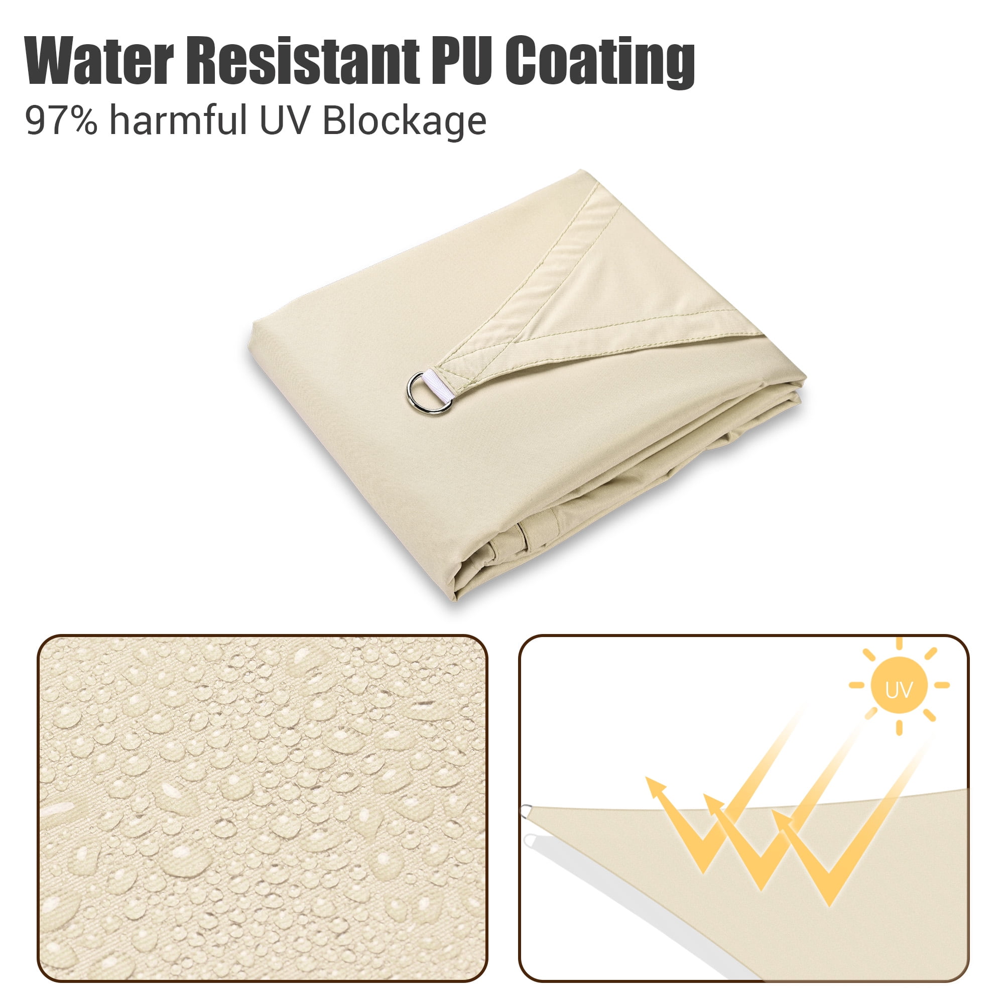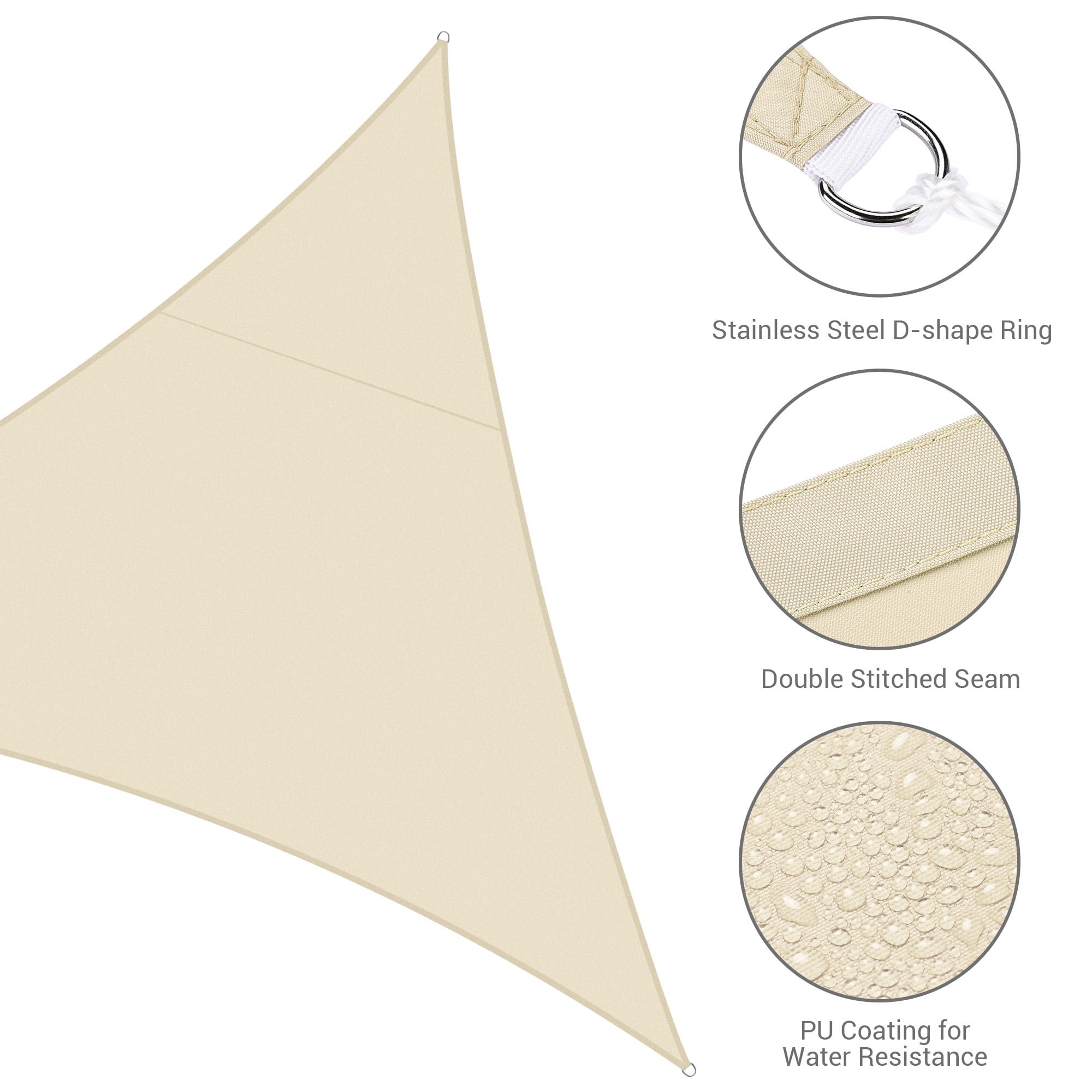 Decorative & Effective Shading – 10 ft Triangle Sun Shade Sail, classic color to add a touch of modernity to your space, blends in perfectly with versatile scenarios like backyard, balcony, porch, pergola, deck, high-end restaurants & hotels; Also, a perfect canopy to offer a cool shelter near the pool for swimmers to rest. Heat Reduction & Water Resistance – Made of 100% brand new 160gsm polyester fabric to efficiently lower the temperature under sail about 50°F (10°C); PU coating on surface to resist water for longer lifespan. UV30+ Protection – Effectively blocks 97% of harmful UV ray to protect your delicate skin from dazzling sun, keeping your area cool and comfy for you to fully enjoy leisure moment in outdoor space. Easy Assembly – Hanging ropes included for easy installation by simply connecting stainless steel D-shape rings and the mounting points; Easy folding when not used, space-saving and convenient. Durable in Use – Double stitched seam reinforces the edge to prevent fraying and ripping; Curved triangle shape helps the sail to keep tight; Color fastness up to European Standard Level 4 to keep long-lasting beauty under sun exposure; 2-year warranty for quality issue