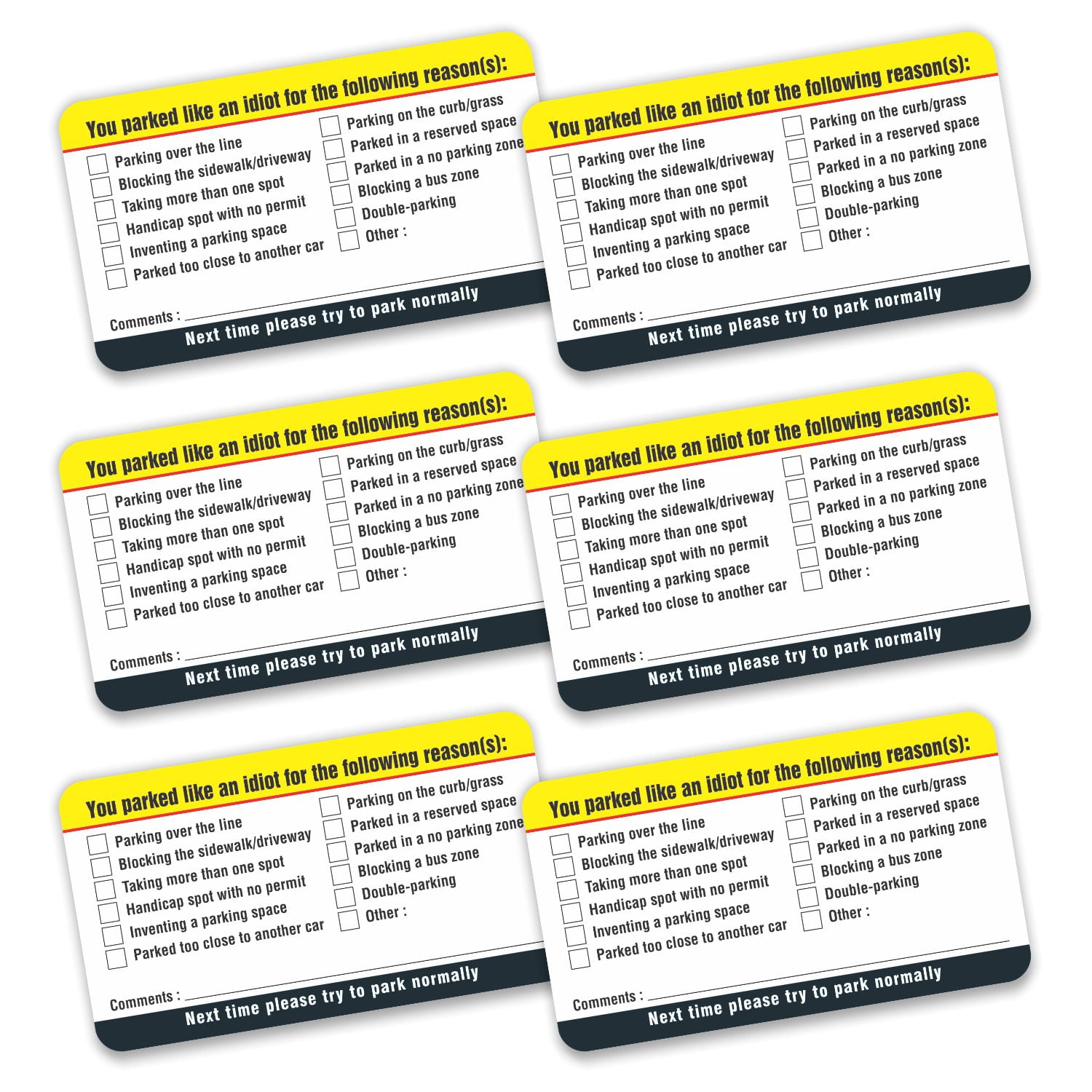 - IMPOSSIBLE TO IGNORE – You can also write your own comments in writable area at back side to tell someone why they park like an idiot. Leave on careless driver’s under the windshield wiper, through the driver’s door window, will send a strong message to them. EXCELLENT NOVELTY GAG GIFT.
