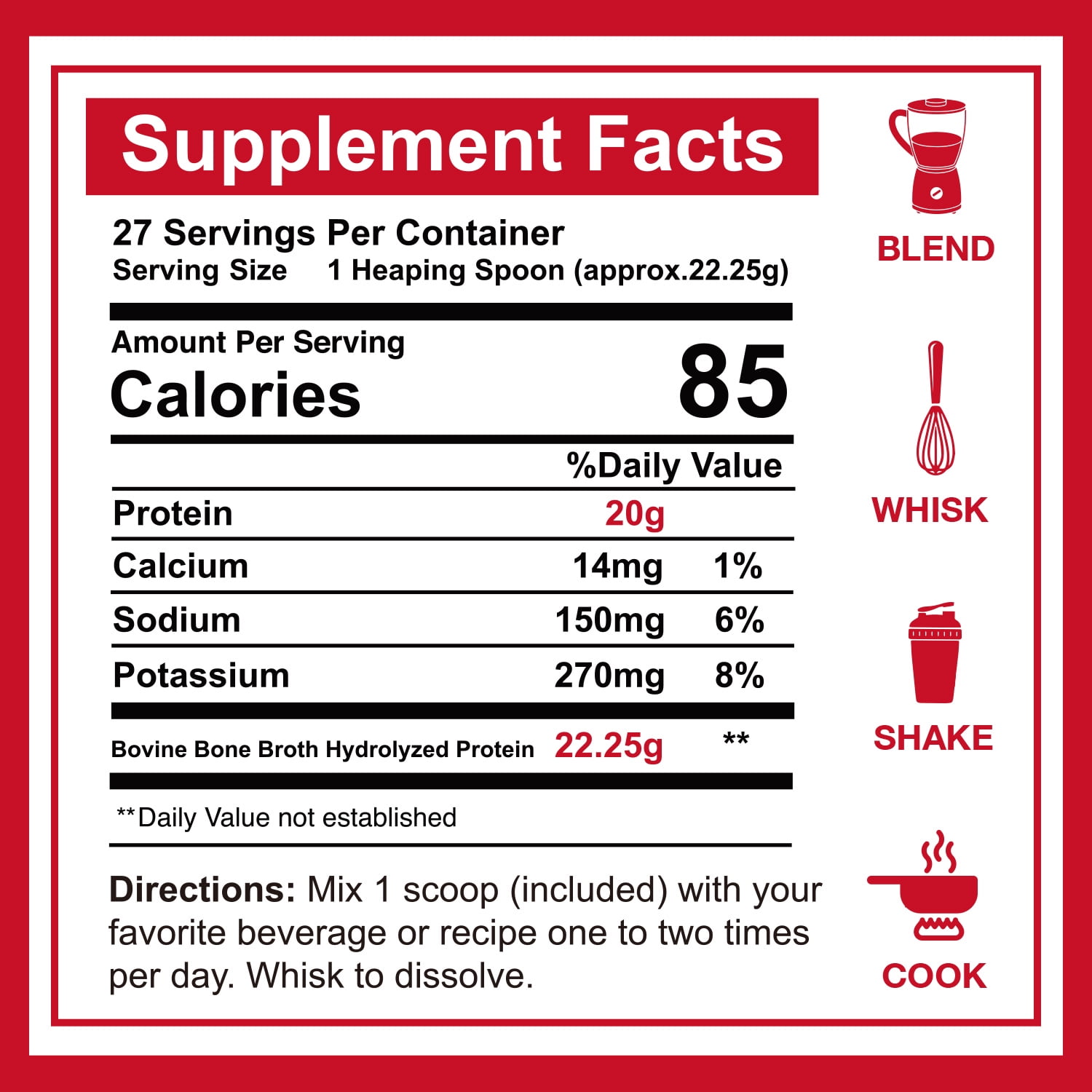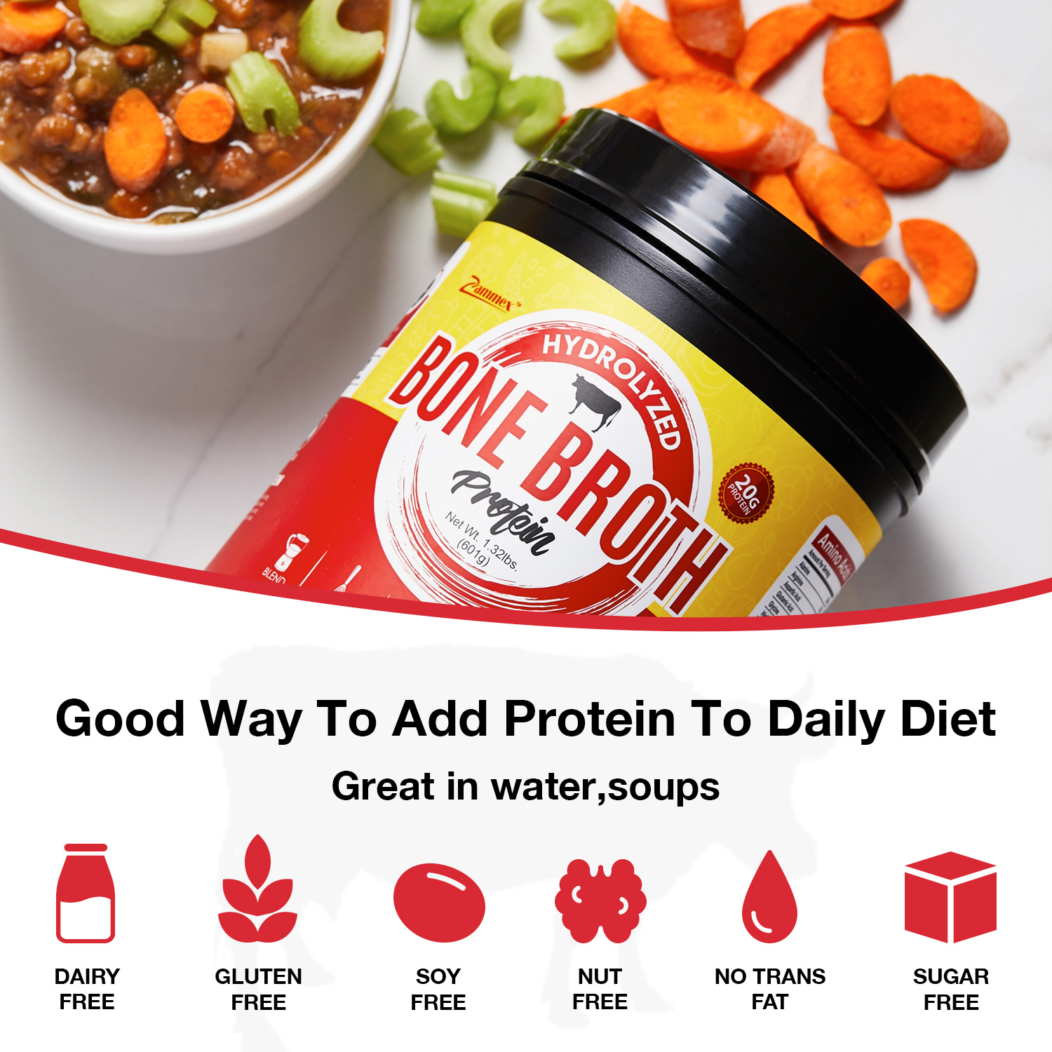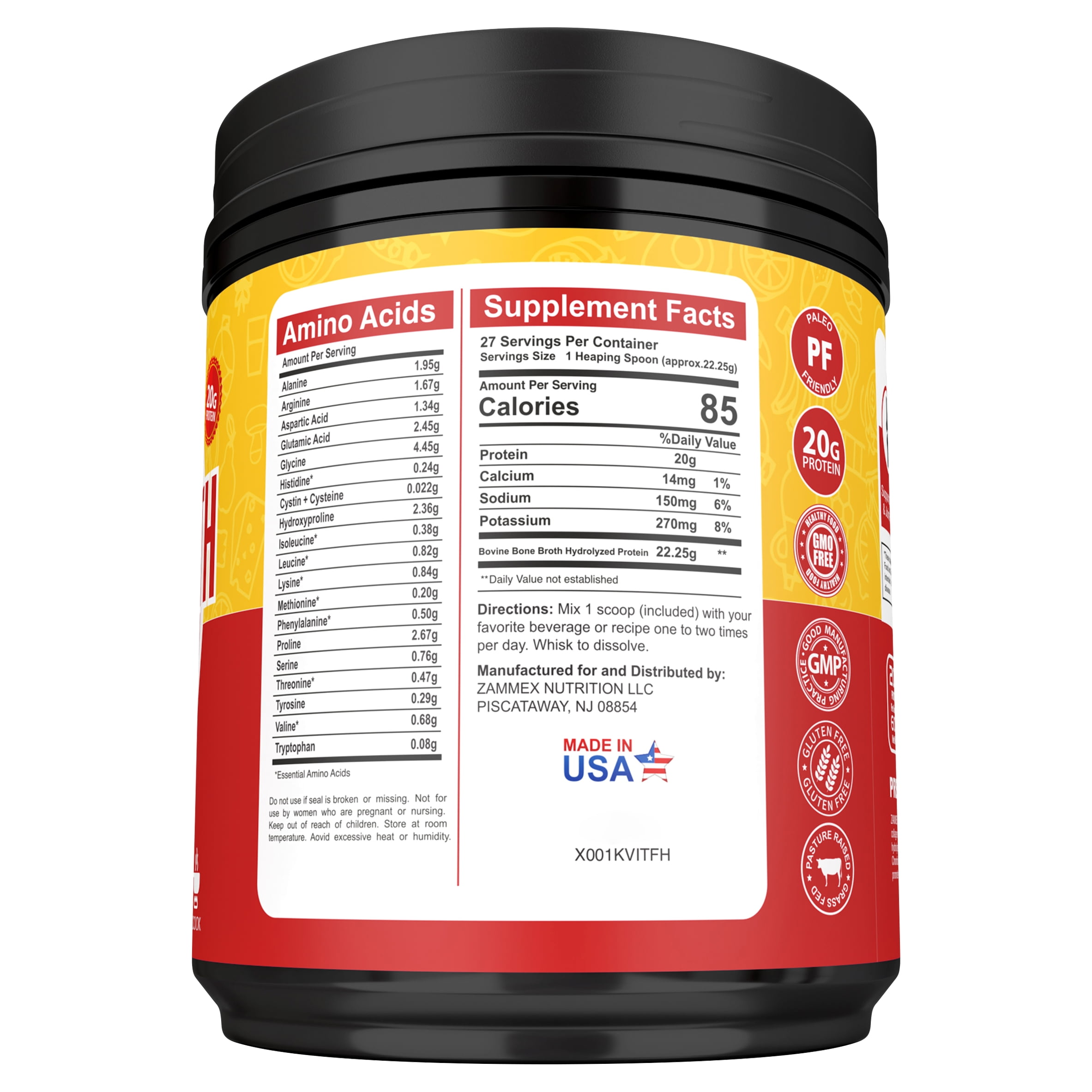 Zammex Bone Broth Protein is made from simmering bovine bone in water which is high in nutrients as many protein components including collagen and gelatin are leached from the bones and connective tissues during the cooking process. The collagen and gelatin are hydrolyzed into amino acids, which greatly increases its bio-availability. Source from Pasture Raised, Grass-Fed, Kosher Friendly, Non-GMO,No added hormones, No additives, No dairy, No gluten, No soy, low sodium.The 19 Naturally-Occuring Amino Acids plus Hydroxy acid oxine and glucosamine contained in this product. More Serving per container, and twice the amount of protein and collagen 1 & 3 compared to other brands.Improve your health naturally, For Skin, Nails, Hair, Joints & Digestion.improves mood.HOW TO USE: Simply add 1 scoop of collagen peptide to coffee, milk, smoothie, juice, or water. Create it your own way. We have advanced our technology to make the bone broth powder more soluble.Unflavored has slight beef flavor,so blends well with other flavors. Good way to add protein to daily diet.*These statements have not been evaluated by the Food and Drug Administration. This product is not intended to diagnose, treat, cure, or prevent any disease.*