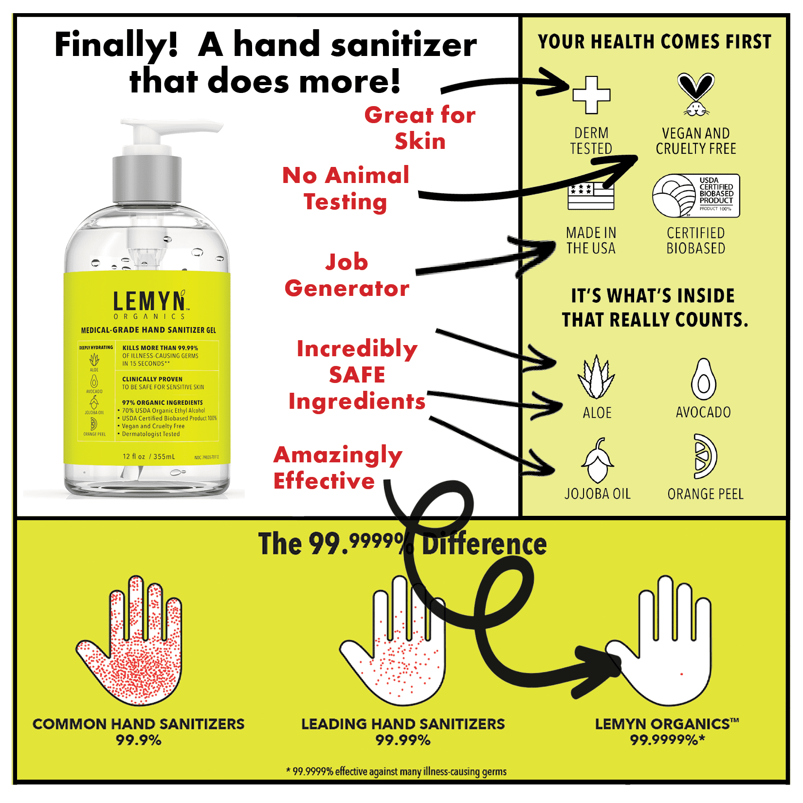 Refreshing Citrus aroma takes hand sanitizing to the next level! 100 times more effective than common brands by effectively eliminating 99.9999% of common harmful germs and bacteria. The gel formula is also safe for sensitive skin leaving your hands softer after each use. It is everything you have ever wanted in a hand sanitizer. Lemyn Organics Medical Grade Hand Sanitizer – 8oz Pump BottleProven. Effective. Green.