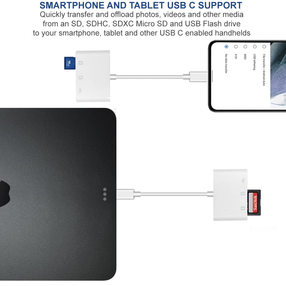 - – USB type C makes this card reader reversible, plugging in any direction and it is compatible with all computers, Laptops, Macs and Smartphones that have USB C connection (Some require Adapters, sold separately)