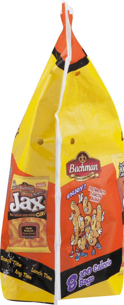 Our cheese puffs are made from the finest ingredients and cooked to perfection! We use the best real cheddar cheese in our puffed cheese curls. Jax are slow baked…tastes great, 0g trans fat. Snack time. Lunch time. Any time.Bachman Jax 100 Calorie Cheddar Cheese Puffed Curls, 2-Pack 8 Count Bags